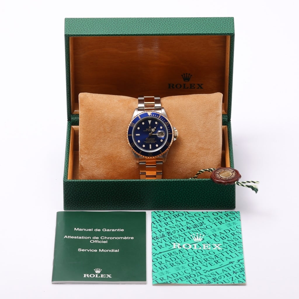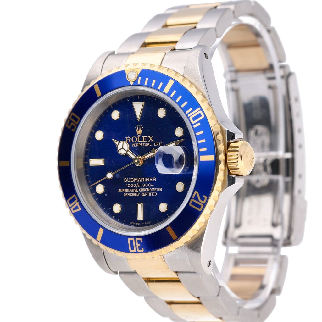A Rolex Submariner reference 16613, crafted in stainless steel and 18ct yellow gold, featuring the iconic blue dial and matching bezel. This combination, often referred to as the “Bluesy,” delivers a distinctive and luxurious take on the traditional Submariner design. The 40mm case retains the era's balanced proportions, while the sunburst blue dial shifts beautifully in the light, complemented by gold accents that enhance both depth and presence.