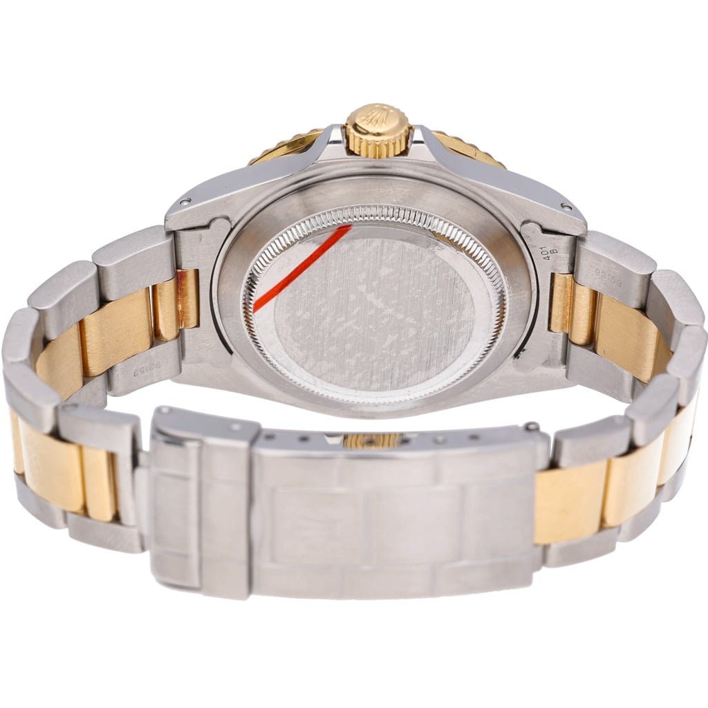 Powered by the automatic Rolex Calibre 3135 movement, this reference is celebrated for its robustness, precision, and long-term reliability. The aluminium bezel insert reflects the charm of pre-ceramic Submariners, while the Oyster case ensures water resistance to 300 metres, maintaining its status as a true professional dive watch. The steel-and-gold Oyster bracelet, finished with a steel clasp, offers both durability and everyday comfort.