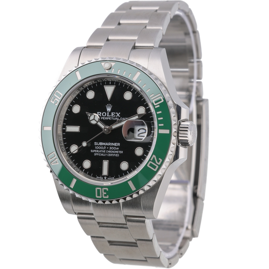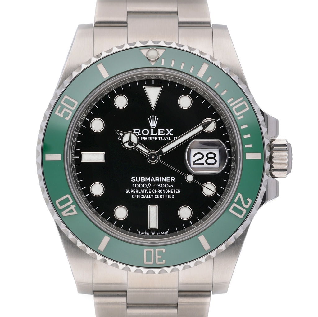 A Rolex Submariner Date 126610LV, crafted in stainless steel with a green ceramic bezel and contrasting black dial, is often referred to as the “Starbucks” within the watch community. This modern evolution of the classic Submariner introduces a refined case profile while retaining the iconic colour combination that has become one of the most recognisable in the range.