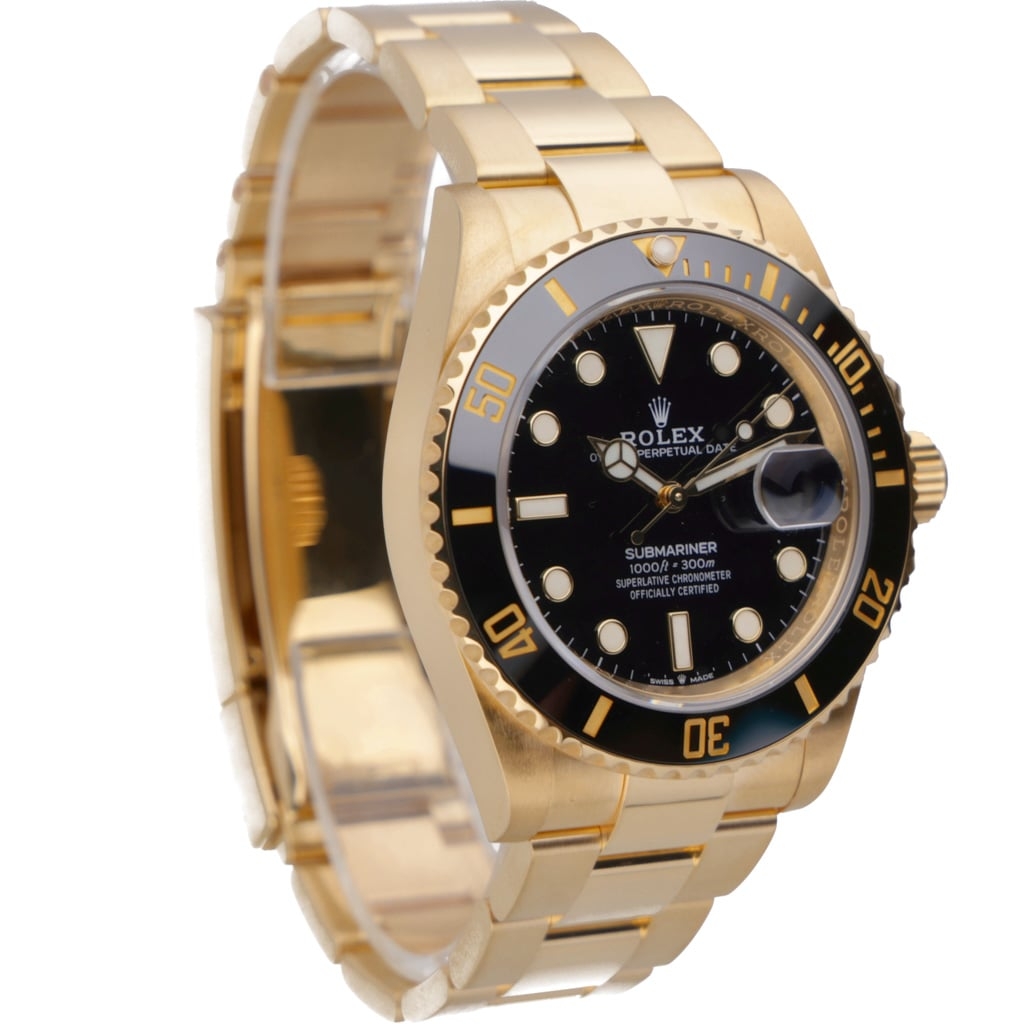 A Rolex Submariner reference 126618LN, crafted entirely in 18ct yellow gold and paired with a black dial and matching black Cerachrom bezel. The 41mm case represents the latest evolution of the Submariner, offering sharper proportions and a more refined wrist presence, while retaining the unmistakable DNA that has defined the model for decades. The contrast between solid-gold construction and the deep black dial creates a bold, high-impact aesthetic that immediately stands out.