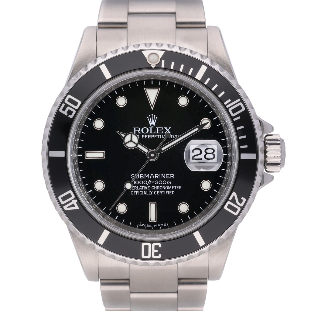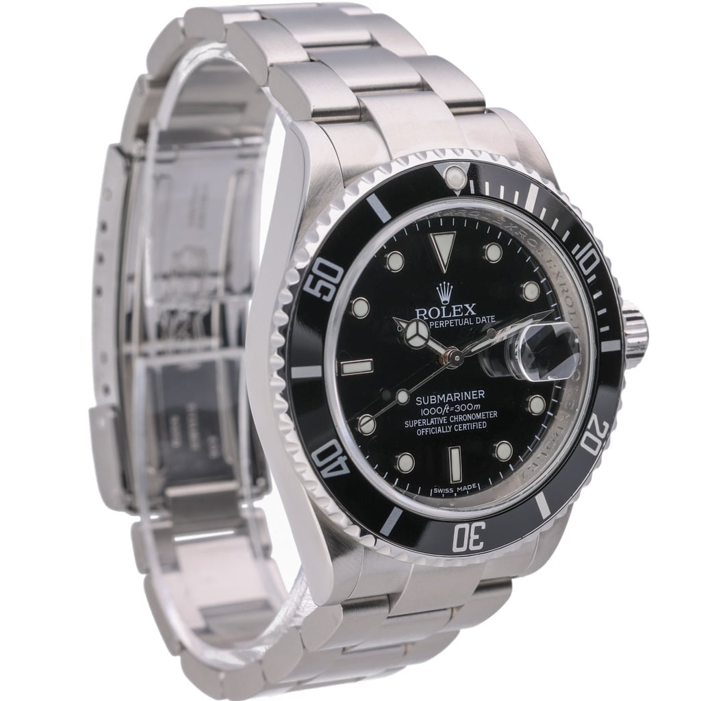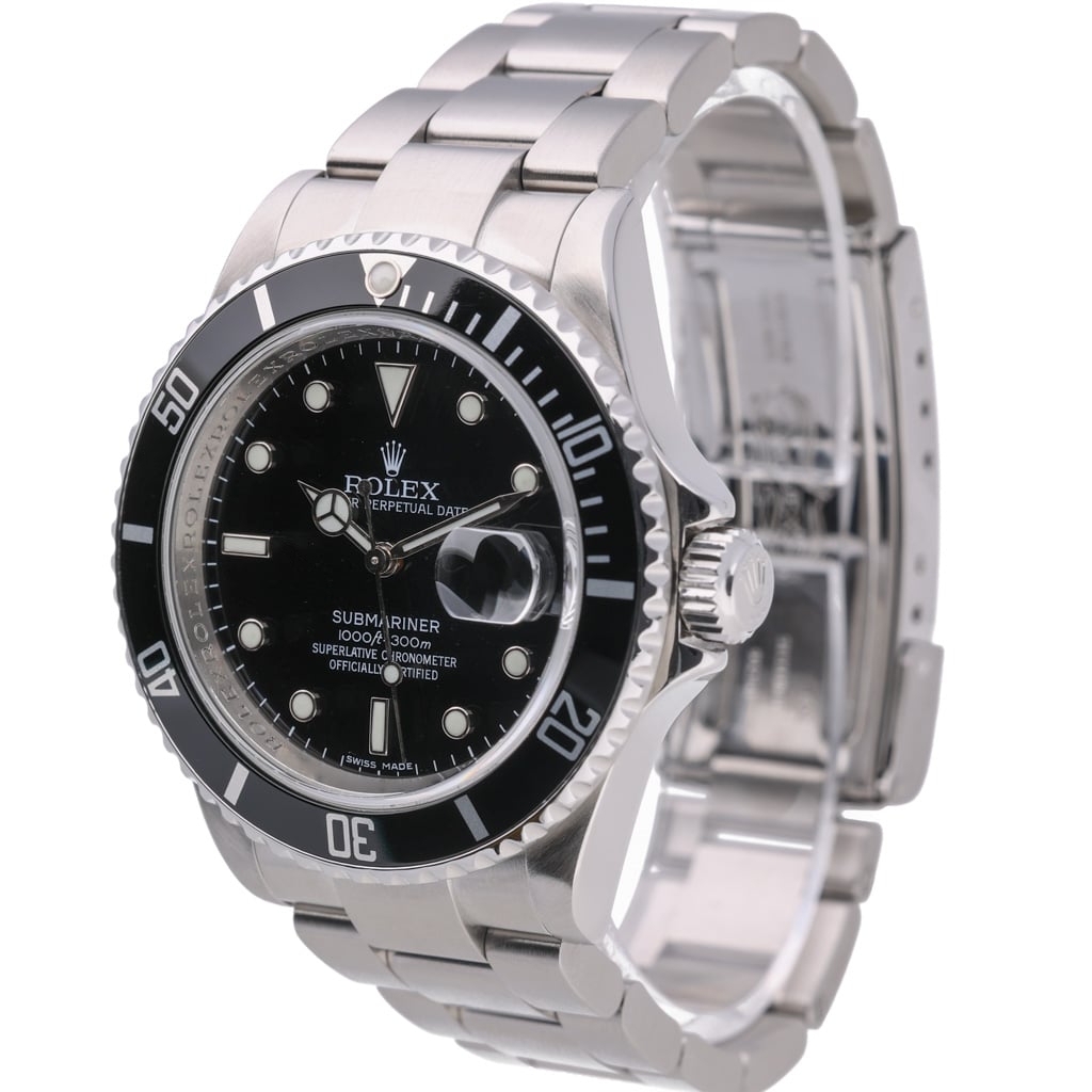 A Rolex Submariner reference 16610 dated to 2025! This is a discontinued Rolex Submariner 16610 (circa 2000s) sold as new old stock, with an original Rolex warranty card dated 2025, activating the manufacturer's warranty until 2030. Presented in stainless steel with a black bezel and matching black dial, representing one of the final generations of the iconic pre-ceramic Submariner.