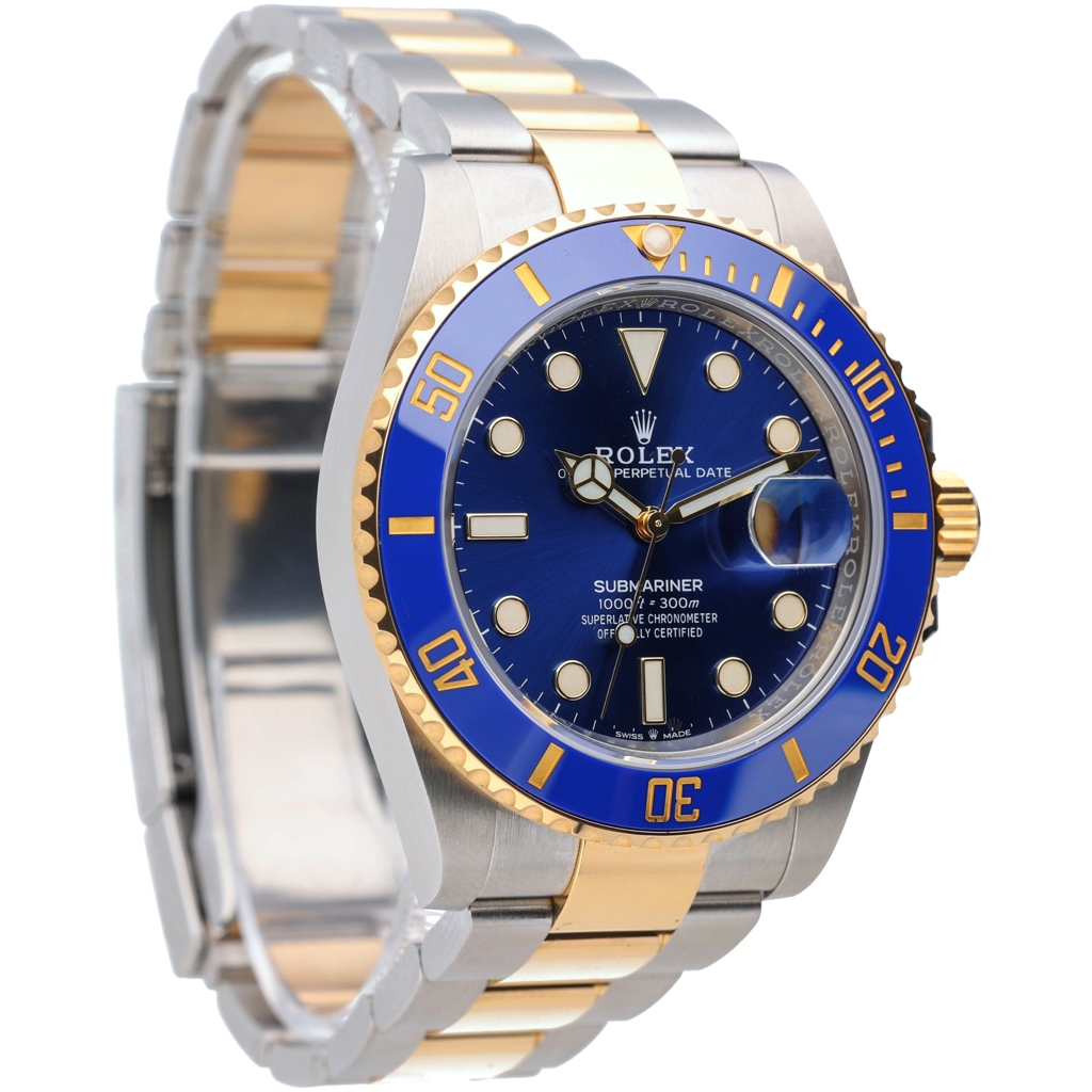A bi-metal Rolex Submariner presents a bold and luxurious interpretation of one of Rolex’s most iconic professional dive watches. Crafted from stainless steel and 18ct yellow gold, the 41mm Oyster case offers a confident, modern presence on the wrist. The vibrant blue Cerachrom bezel is paired with a matching blue dial, creating a striking contrast against the gold accents. Luminous hour markers and Mercedes hands ensure exceptional legibility, while the Oyster bracelet completes the unmistakable Submariner profile.