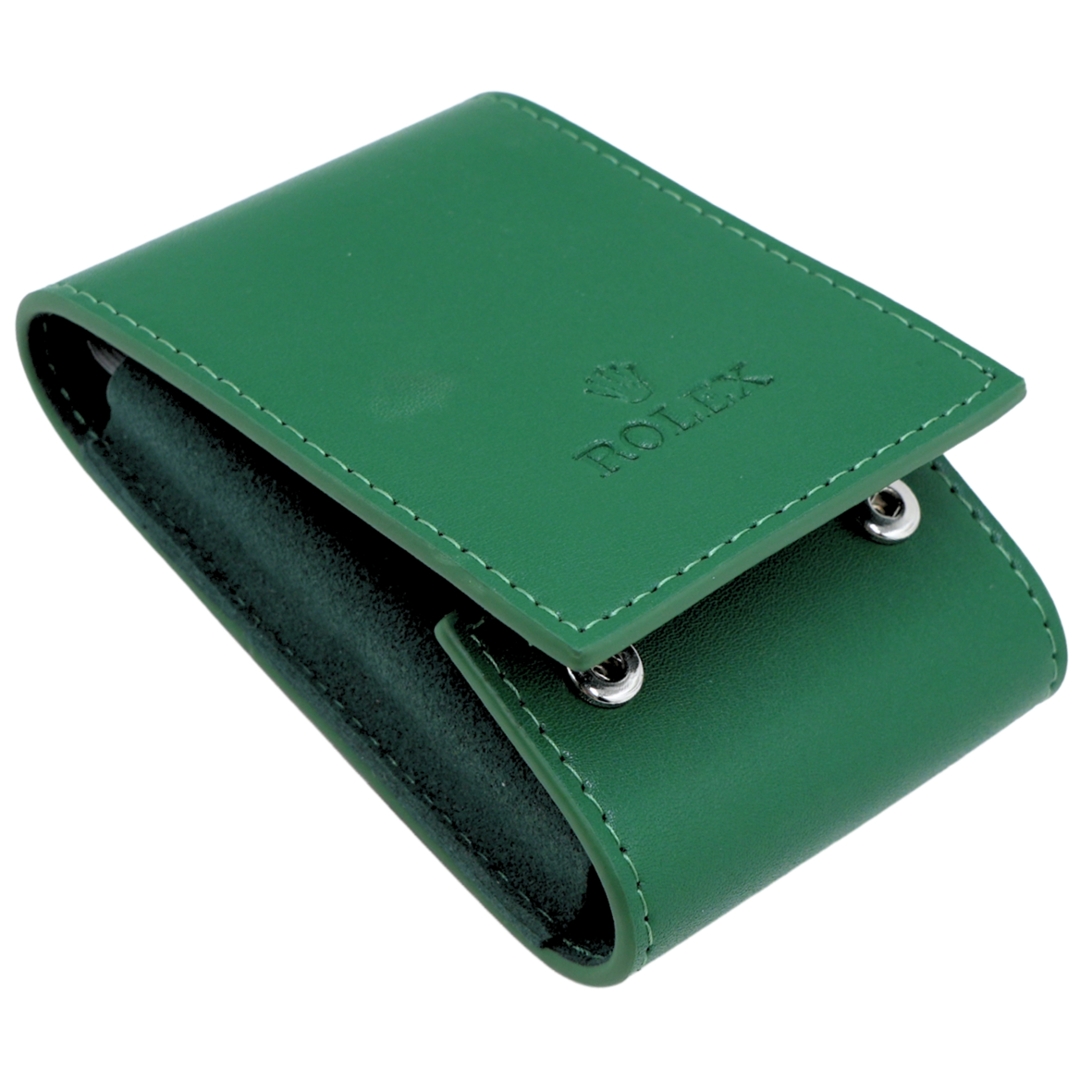 The Rolex travel case is the epitome of luxury and sophistication, designed for the discerning watch enthusiast. Crafted from premium materials, this case is enveloped in a rich, opulent green hue that immediately catches the eye. The front of the case proudly features the iconic Rolex logo, meticulously embossed to exude elegance and class.