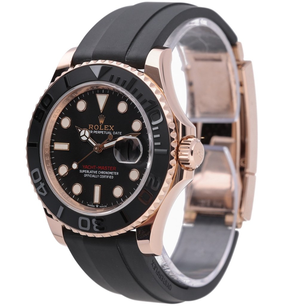 A Rolex Yacht-Master 40, model number 126655, is a testament to Rolex's commitment to excellence, craftsmanship, and innovation. Released in 2025, this luxurious timepiece features a stunning 40mm 18ct rose gold case that exudes sophistication. The striking black Oysterflex rubber strap strikes a perfect balance between comfort and durability, making it ideal for everyday wear and active use.