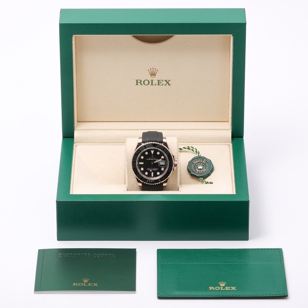 A Rolex Yacht-Master 40, model number 126655, is a testament to Rolex's commitment to excellence, craftsmanship, and innovation. Released in 2024, this luxurious timepiece features a stunning 40mm 18ct rose gold case that exudes sophistication. The striking black Oysterflex rubber strap strikes a perfect balance between comfort and durability, making it ideal for everyday wear and active use.