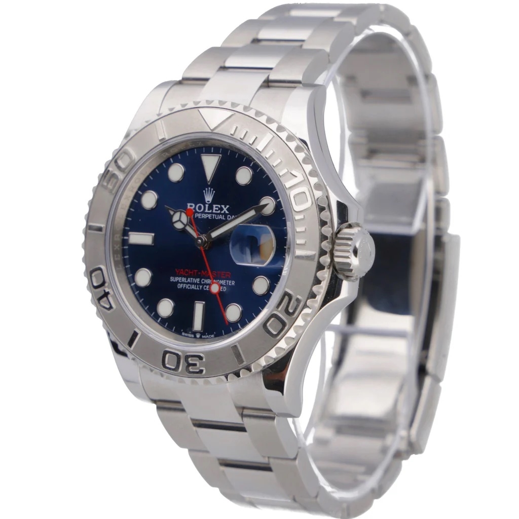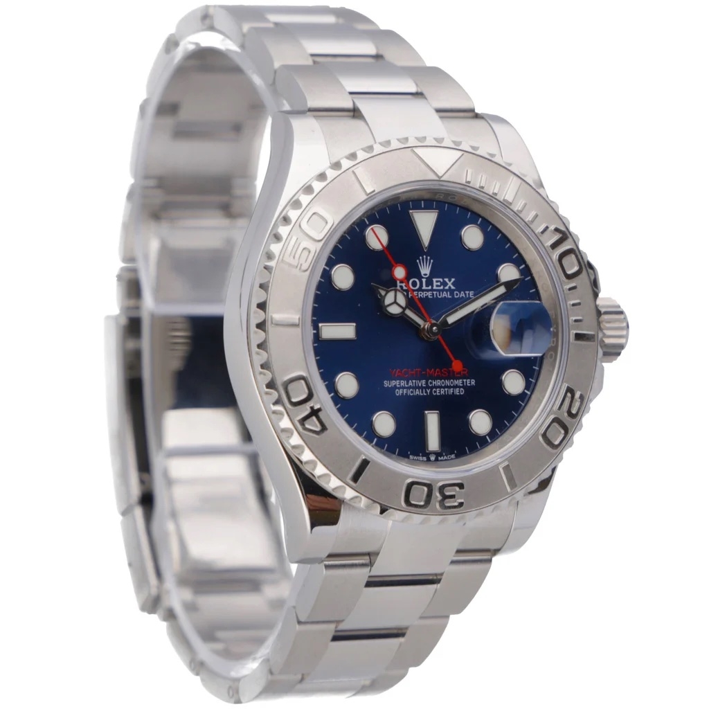 A Rolex Yacht-Master 126622, crafted in stainless steel and fitted with a solid 950 platinum bezel and striking sunburst blue dial — a refined, maritime-inspired design that sets this model apart within Rolex's sport watch collection. With its 40mm Oyster case and elegant proportions, this reference blends sporty functionality with unmistakable luxury.