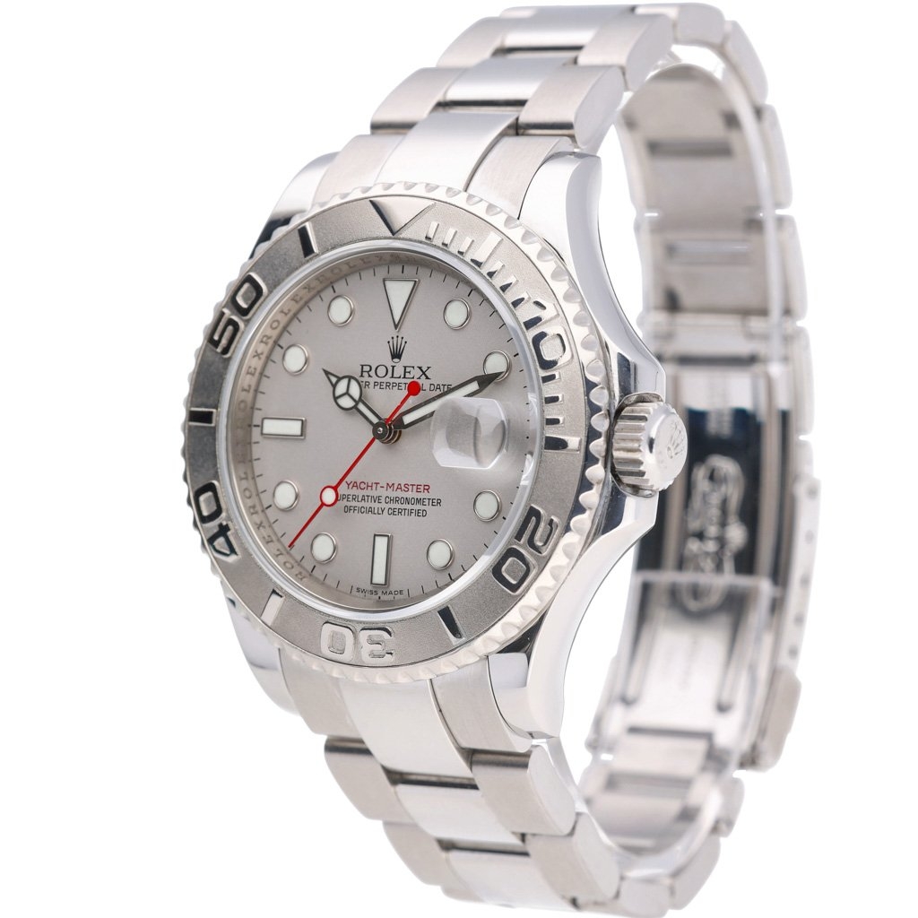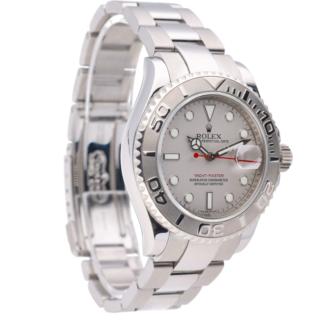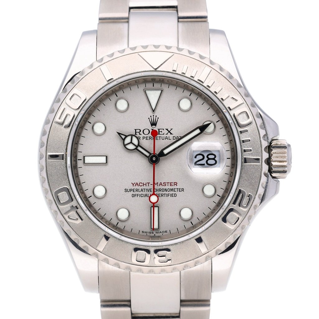 A Rolex Yacht-Master Watch, Stainless Steel with a Platinum Bezel on a Silver Dial
