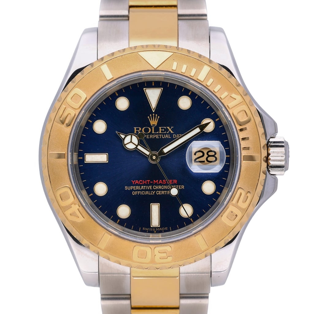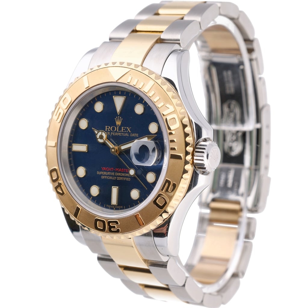 A Bi-Metal Rolex Yacht-Master Watch in stainless steel and 18ct yellow gold, presented here in the 35mm configuration with an 18ct yellow gold bezel and a striking blue dial. Its balanced proportions and rich colour contrast give this reference 168623 a distinctive presence, equally suited to everyday wear and more refined settings.