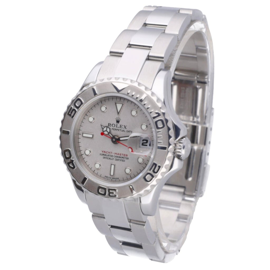 A Rolex Yacht-Master Watch, model 169622, presented in immaculate condition. This 2003 reference pairs stainless steel with a platinum bidirectional bezel and features a refined silver dial with raised hour markers and a red seconds hand. It features a balanced, elegant profile and is powered by the Rolex Calibre 2235 automatic movement. The watch is supplied with its original Rolex paperwork, presentation box, and a 12-month WLC warranty.