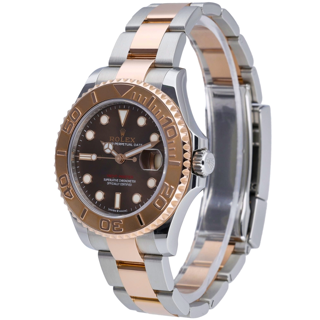A bi-metal Rolex Yacht-Master reference 268621 pairs stainless steel with 18ct rose gold, complemented by the distinctive chocolate dial that defines this elegant sports model. The 37mm Oyster case is fitted with a rose gold bidirectional rotatable bezel featuring raised numerals, while luminous hour markers ensure excellent legibility in all conditions.