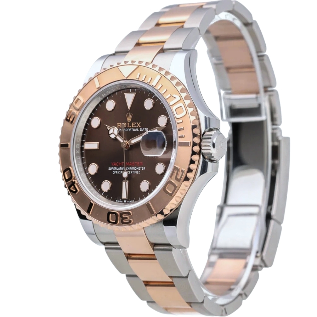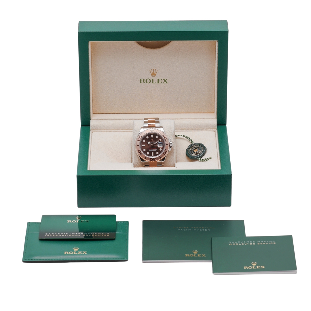A bi-metal Rolex Yacht-Master reference 126621 is a refined modern sports watch that blends luxury materials with understated versatility. Crafted from stainless steel and 18ct rose gold, the 40mm Oyster case is paired with a solid rose gold bezel and a rich chocolate dial, creating a warm, contemporary aesthetic. Produced in 2024, this example is presented in immaculate condition.