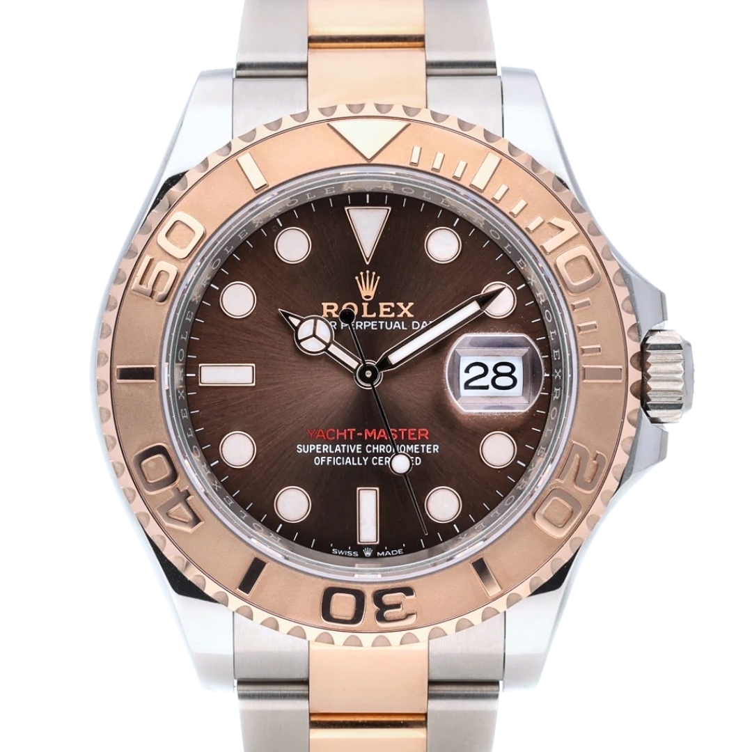 This Rolex Yacht-Master 40 reference 126621 is crafted in stainless steel and 18ct Everose gold, combining Rolex’s robust Oyster architecture with a more refined, nautical character. The warm chocolate dial is a defining feature of this reference, offering rich depth and contrast against the raised Everose gold bezel with matte-finished numerals. The 40mm case sits comfortably on the wrist, striking a balance between sport and luxury that defines the modern Rolex Yacht-Master collection.