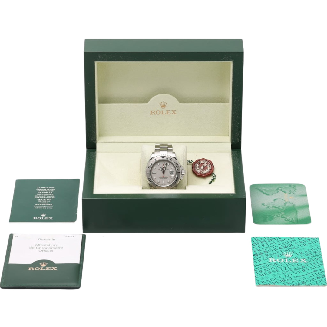 This Rolex Yacht-Master reference 16622 is a classic example of Rolex’s more refined approach to the sports watch, combining stainless steel with a solid platinum bezel and a matching grey dial. The 40mm Oyster case offers versatile proportions, while the sandblasted platinum bezel provides a distinctive matte finish that sets this generation apart from later ceramic models. Red accents on the seconds hand and dial text add subtle contrast and unmistakable Yacht-Master character.