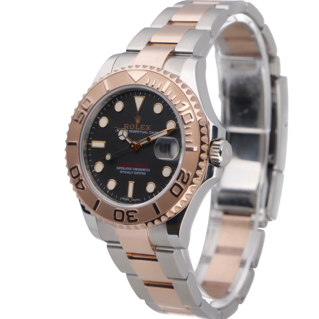 A bi-metal Rolex Yacht-Master reference 268621 pairs stainless steel with 18ct rose gold, complemented by the distinctive charcoal dial that defines this elegant sports model. The 37mm Oyster case is fitted with a rose gold bidirectional rotatable bezel featuring raised numerals, while luminous hour markers ensure excellent legibility in all conditions.