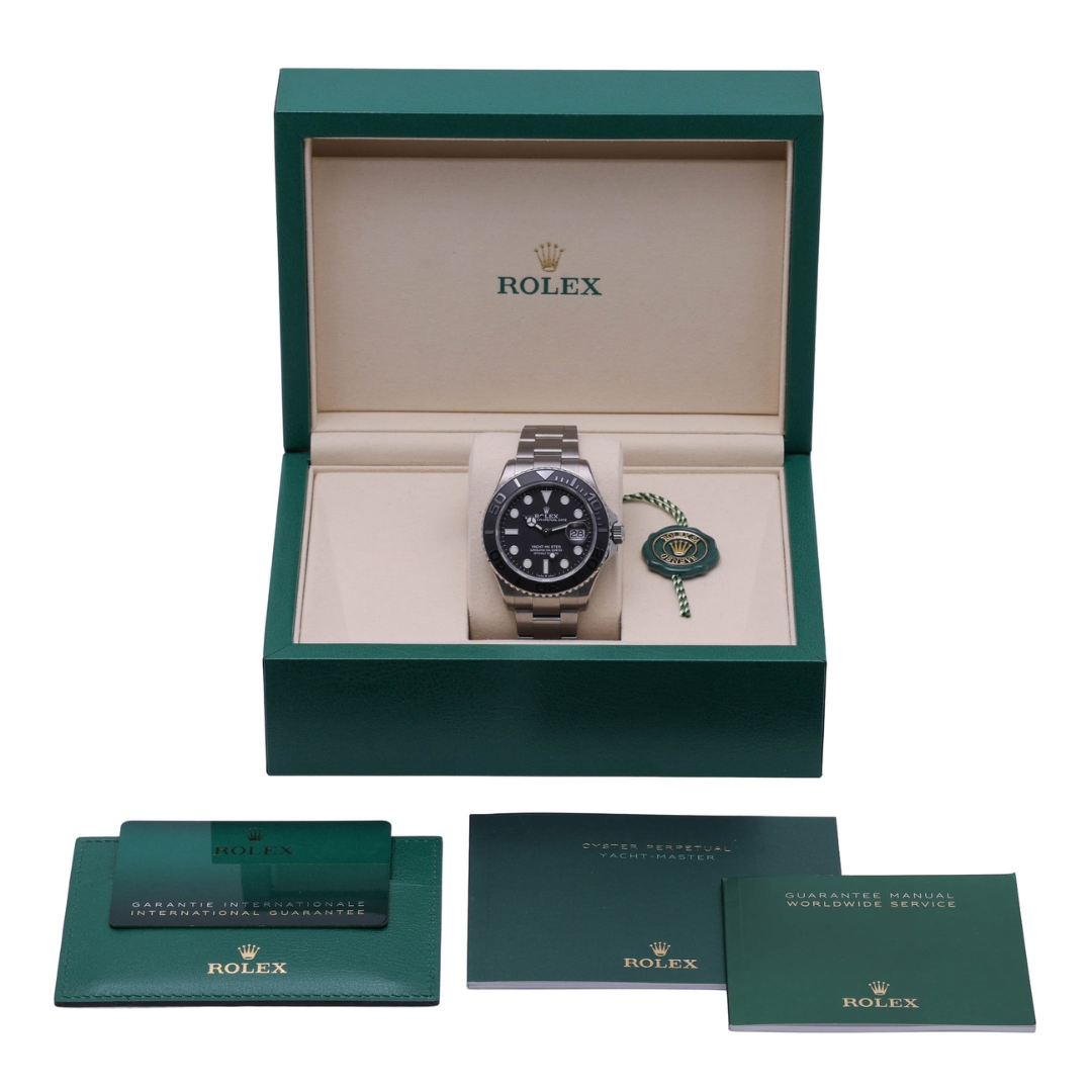 A Rolex Yacht-Master 42 reference 226627 in RLX Titanium, featuring a matte black Cerachrom bezel with raised graduations and an intense black dial. This modern 42mm iteration introduces a lighter, more technical execution of the Yacht-Master, combining the brand’s maritime heritage with a contemporary tool-watch aesthetic.