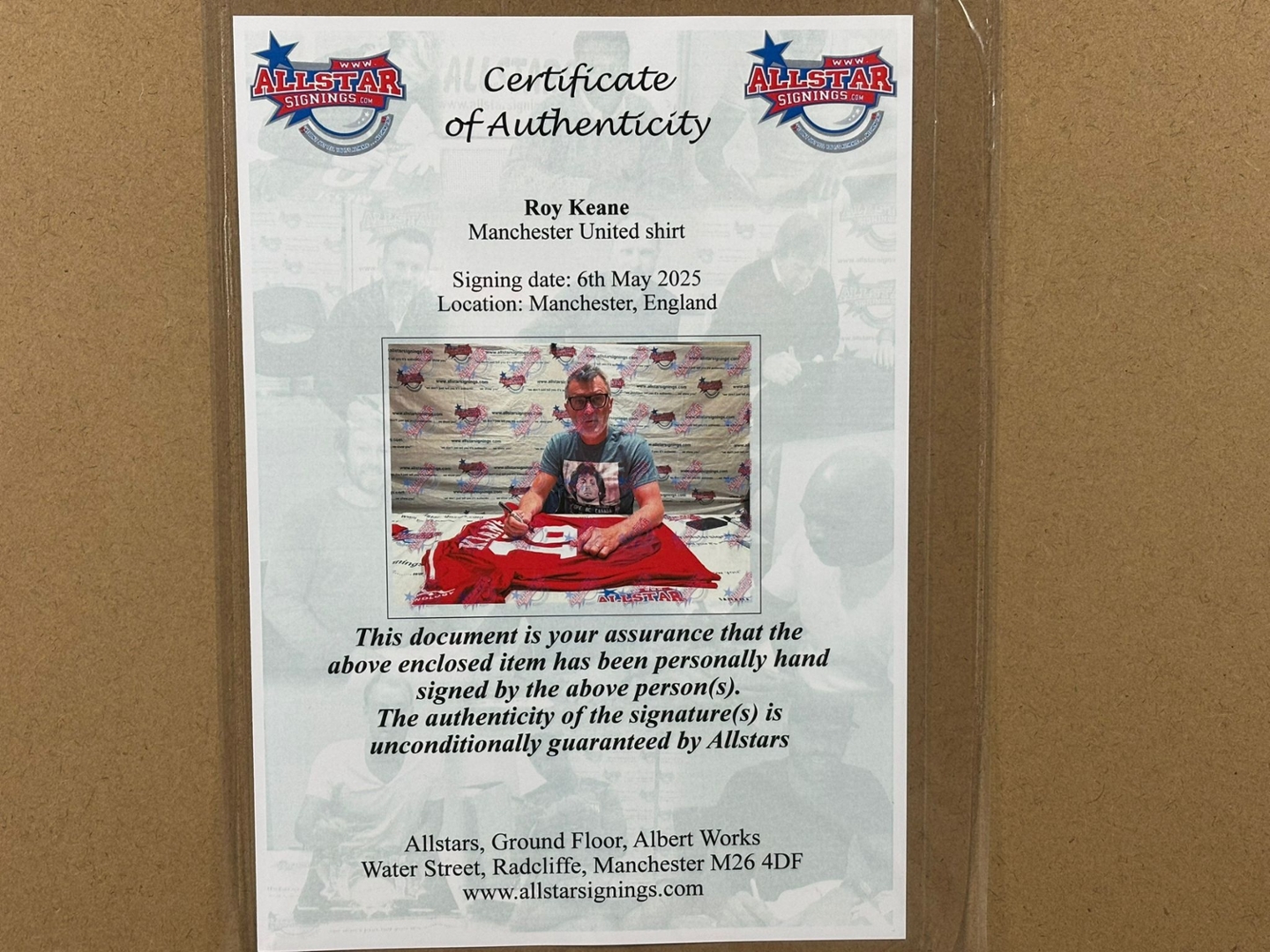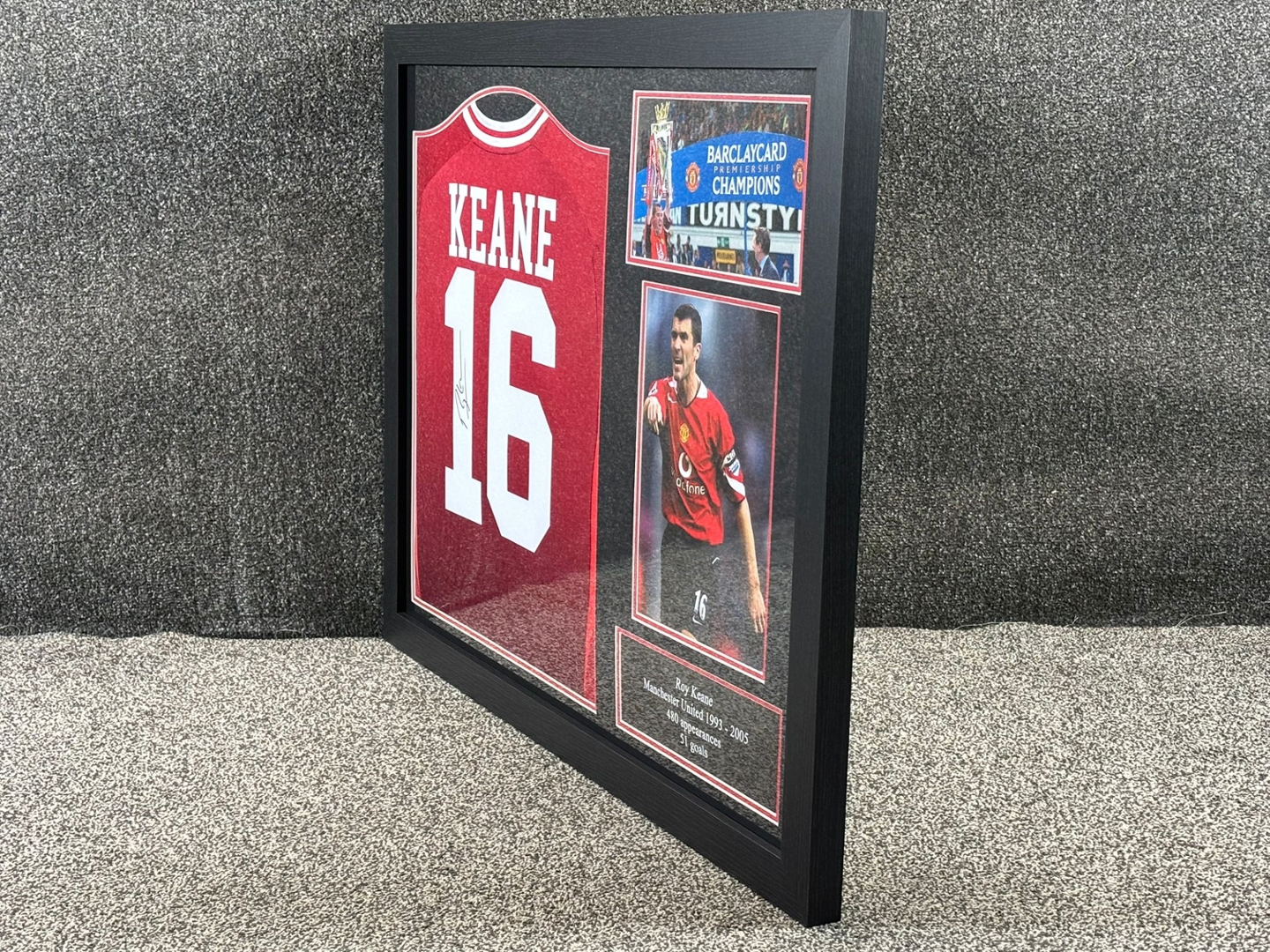The iconic red number 16 shirt, personally signed by Roy Keane, is accompanied by dynamic imagery celebrating his time as Manchester United’s captain and midfield powerhouse. A plaque beneath the shirt details his remarkable career with the club from 1993 to 2005, including 480 appearances and 51 goals.