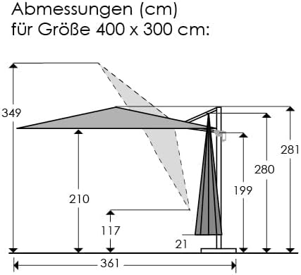 A brand new Schneider Rhodos Grande cantilever parasol, designed to deliver exceptional shade coverage and contemporary outdoor style. Measuring approximately 400cm x 300cm, this generously sized umbrella provides a wide rectangular canopy ideal for large patios, garden seating areas, or outdoor dining spaces. The sleek overhanging cantilever design allows for unobstructed space beneath, making it both practical and visually refined.