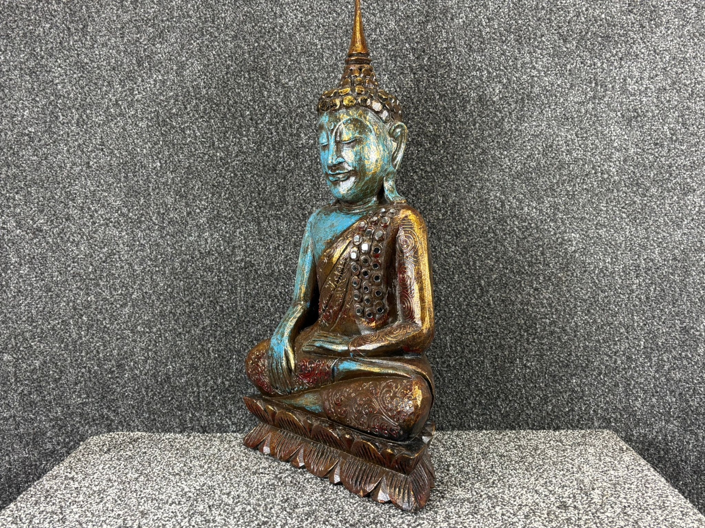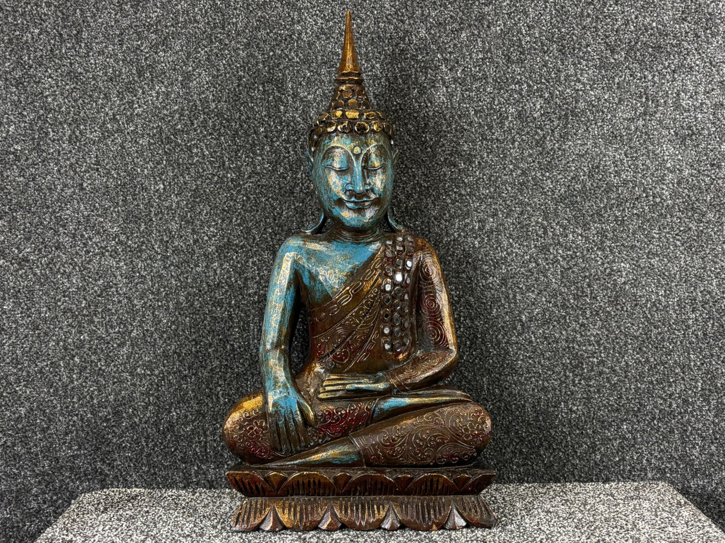 Depicted in a traditional seated pose, the Buddha’s serene expression radiates calm and balance. The rich blue tones are beautifully complemented by gold and bronze accents, highlighting the intricate carvings and detailed robe patterns. Subtle embellishments add a touch of refinement, giving the sculpture a timeless and graceful presence.