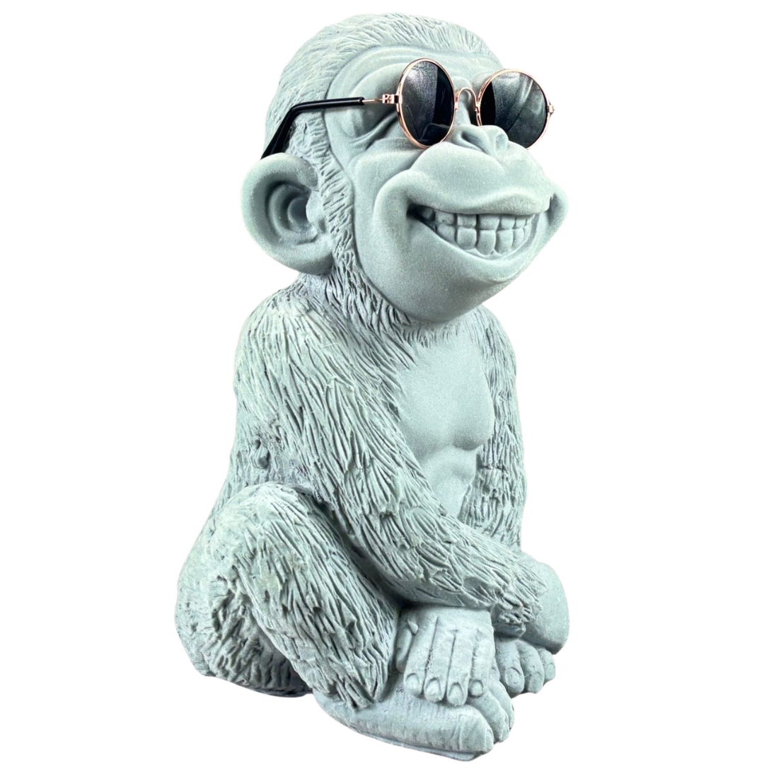 A grey sculpture of a chimp with shades that captures charm, humour, and modern style in one piece. This detailed sculpture features a seated chimpanzee with a wide, toothy grin, brought to life with textured fur and realistic features. What makes this piece stand out is the addition of sleek round sunglasses, giving the chimp a cool, contemporary edge that makes it perfect for quirky interiors.