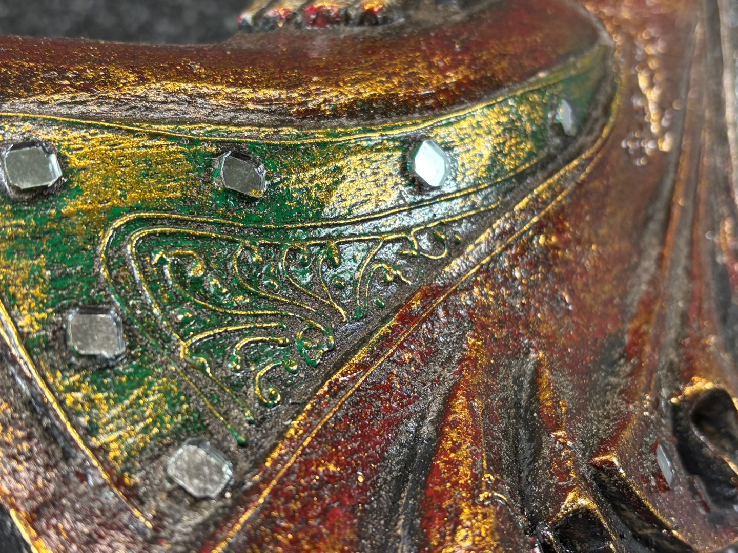 The Buddha is portrayed in a tranquil reclining position, symbolising the moment of enlightenment and inner peace. The gold finish is enhanced with rich tones of red and green, highlighting the intricate detailing of the robe and the refined craftsmanship of the figure. Subtle embellishments add an extra touch of sophistication, bringing depth and texture to the design.