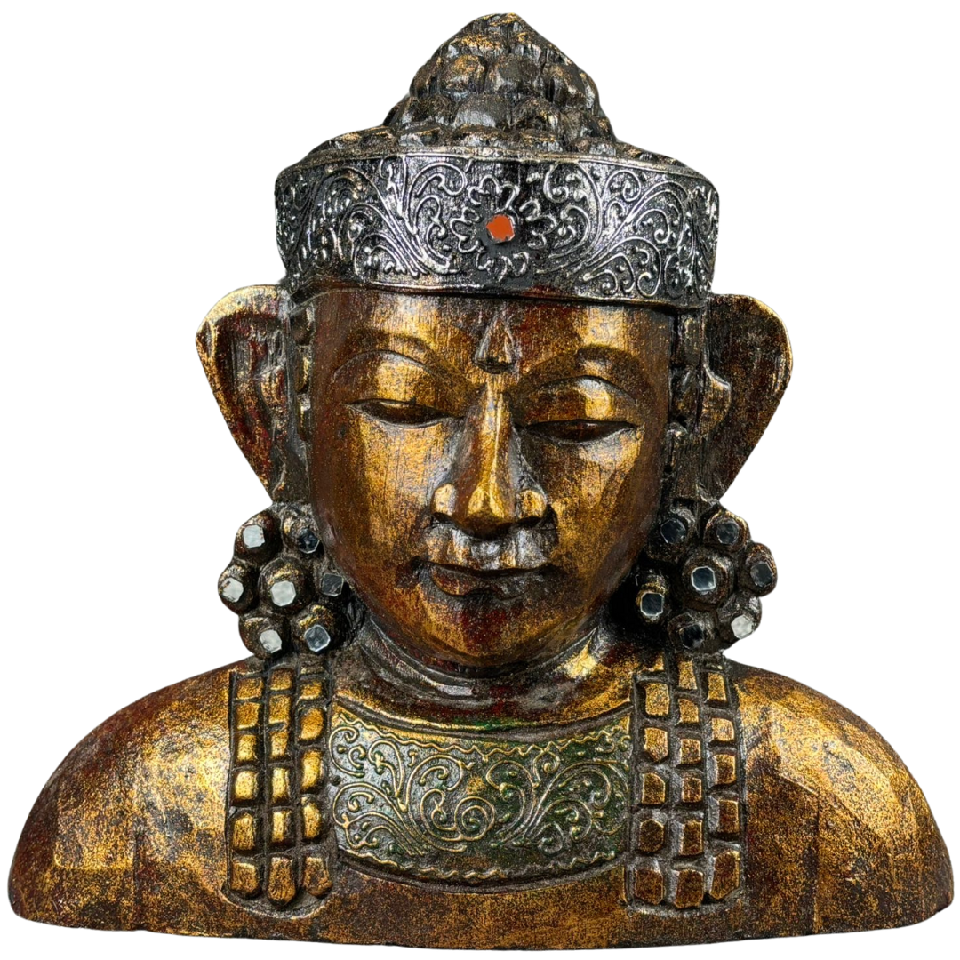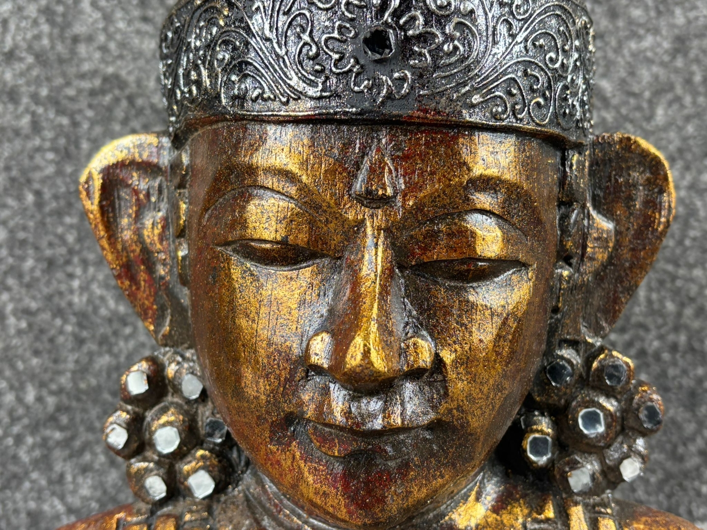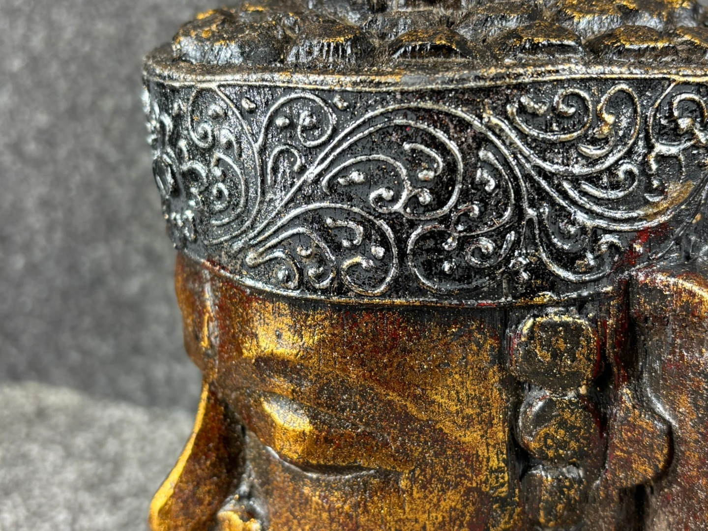 The sculpture features finely carved detailing, with a serene facial expression that embodies mindfulness and enlightenment. Its rich gold and bronze tones are beautifully complemented by ornate patterns on the headpiece and necklace, while the subtle gemstone accents add a refined touch of luxury and depth.