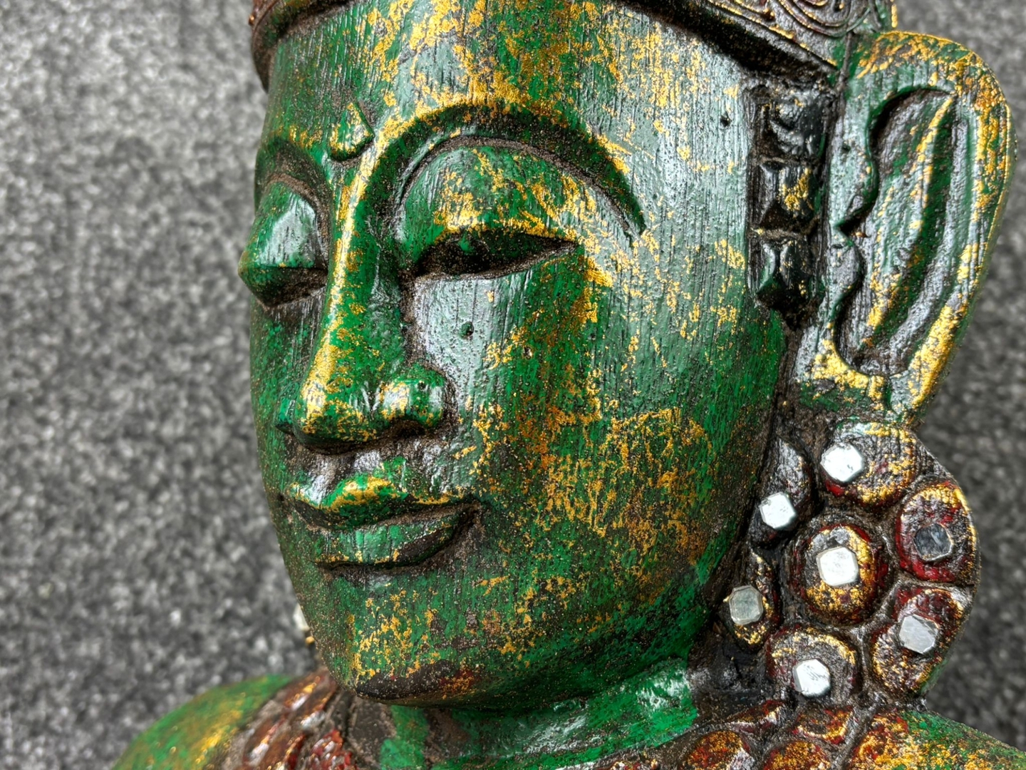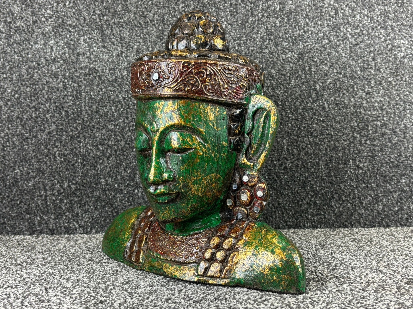 The sculpture features a beautifully detailed design, with a serene facial expression and ornate embellishments throughout. Its rich green and gold tones create a vibrant yet calming aesthetic, enhanced by the intricate carvings on the headband and necklace. The subtle aged finish adds depth and character, evoking a timeless sense of wisdom and tranquillity.