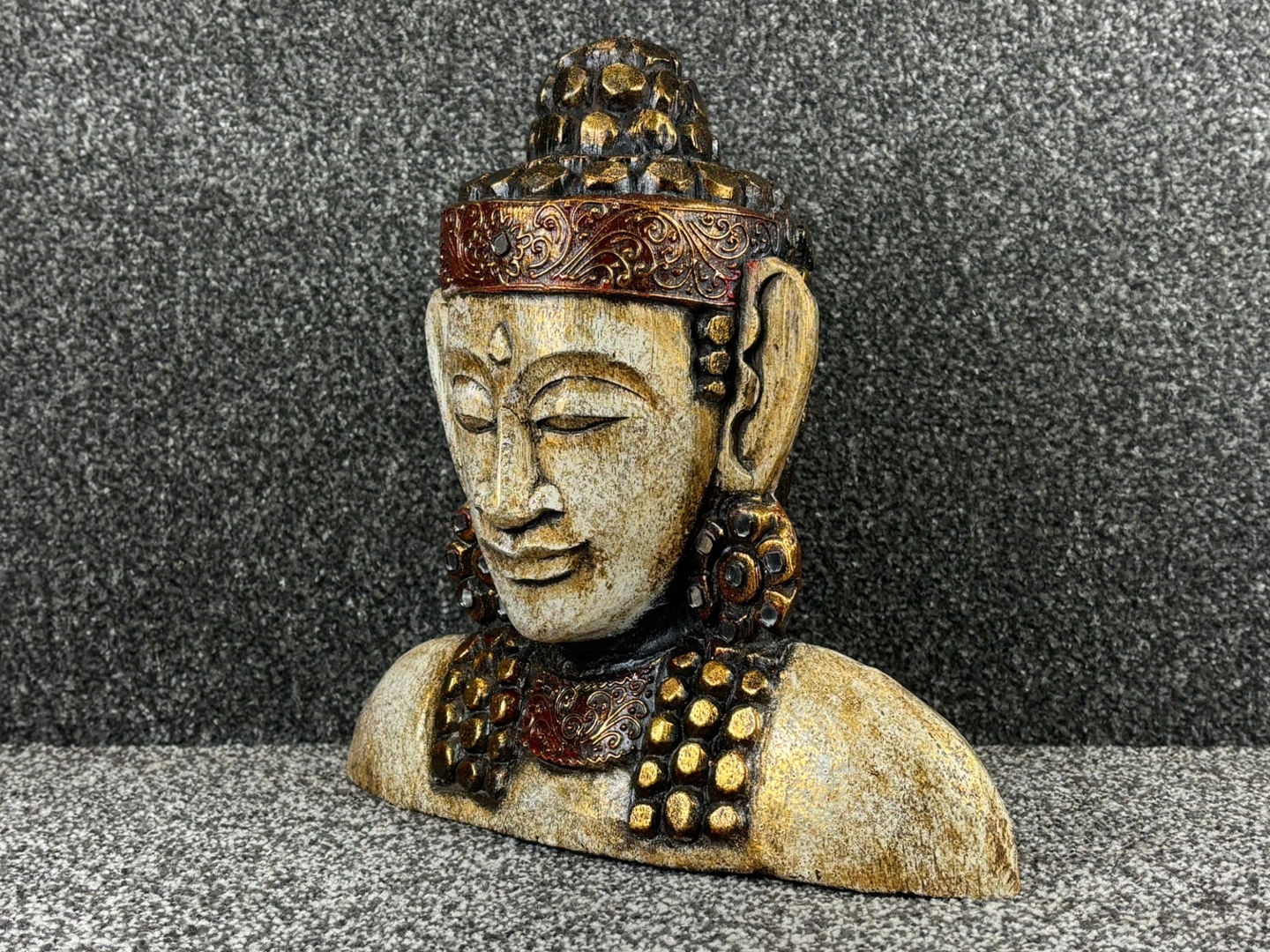 The sculpture features intricate detailing throughout, from the textured curls of the hair to the finely carved facial features that exude calm and contemplation. Accented with subtle gold and bronze tones, the design highlights the Buddha’s peaceful expression and ornate headpiece, creating a sense of timeless elegance and spiritual depth.