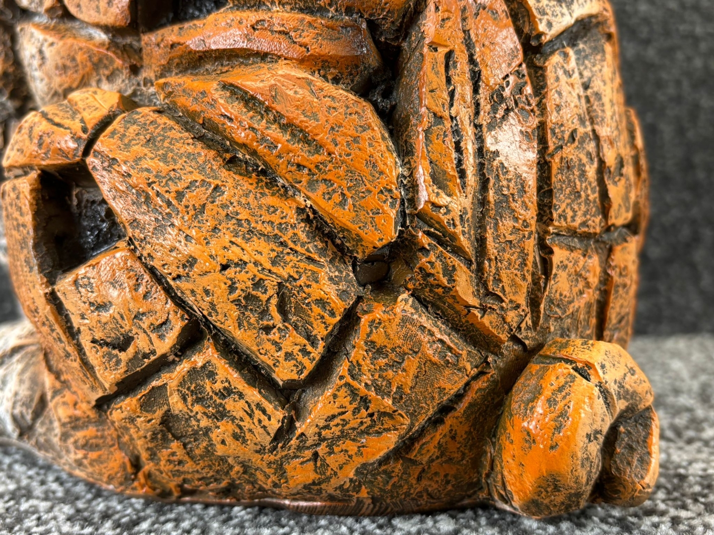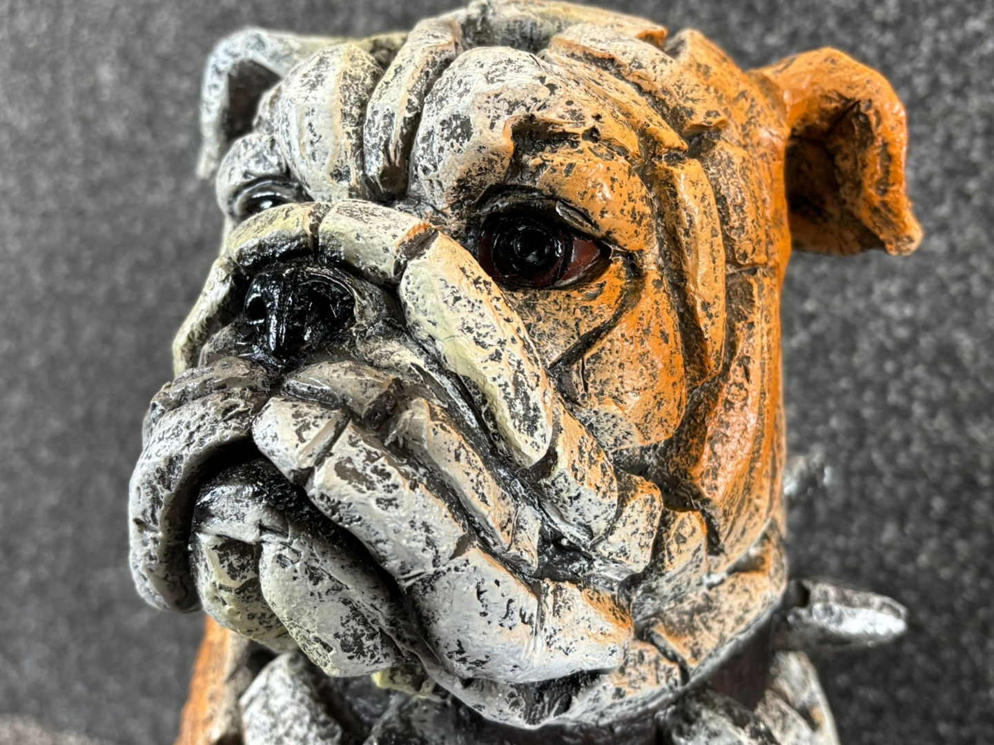 A sculpture of a sitting bulldog that captures the bold and loyal character of this iconic breed. Crafted with impressive texture and detail, the piece features the bulldog’s distinctive wrinkled face, muscular frame, and proud stance. The surface is finished in natural tones of grey, black, and warm tan, giving the sculpture a rugged, stone-like appearance that enhances its lifelike presence.