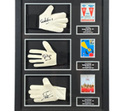 Measuring approximately 86cm in height and 60cm in width, the frame includes detailed embroidery highlighting the match, along with two classic black-and-white action photos and a central plaque that reads “England World Cup Winners 1966.” Presented in a sleek black frame with silver mount, this magnificent display is a powerful tribute to England’s greatest football triumph. Whether you're a lifelong fan or a collector of iconic sporting memorabilia, this piece is an unmissable celebration of football glory.