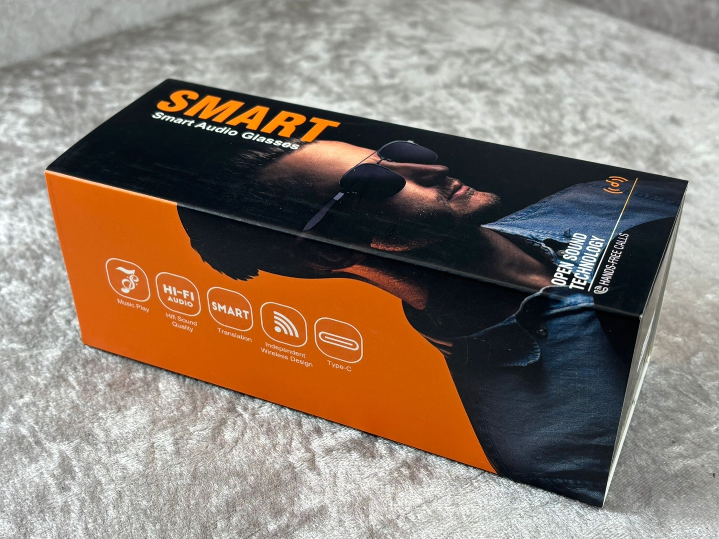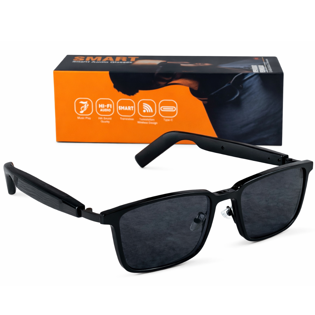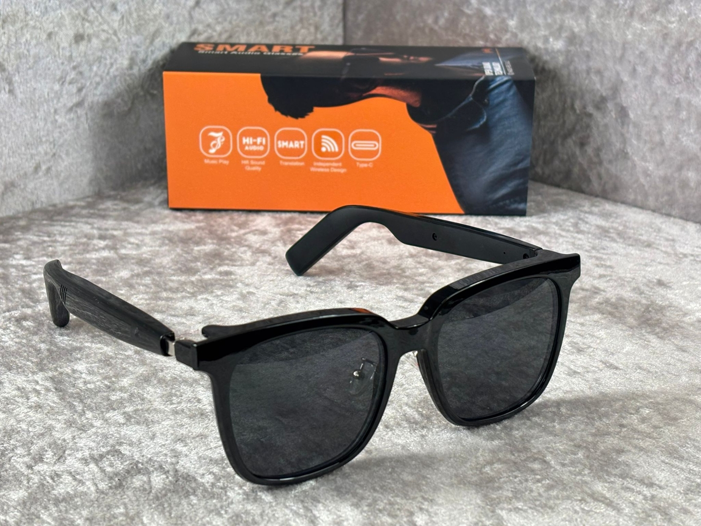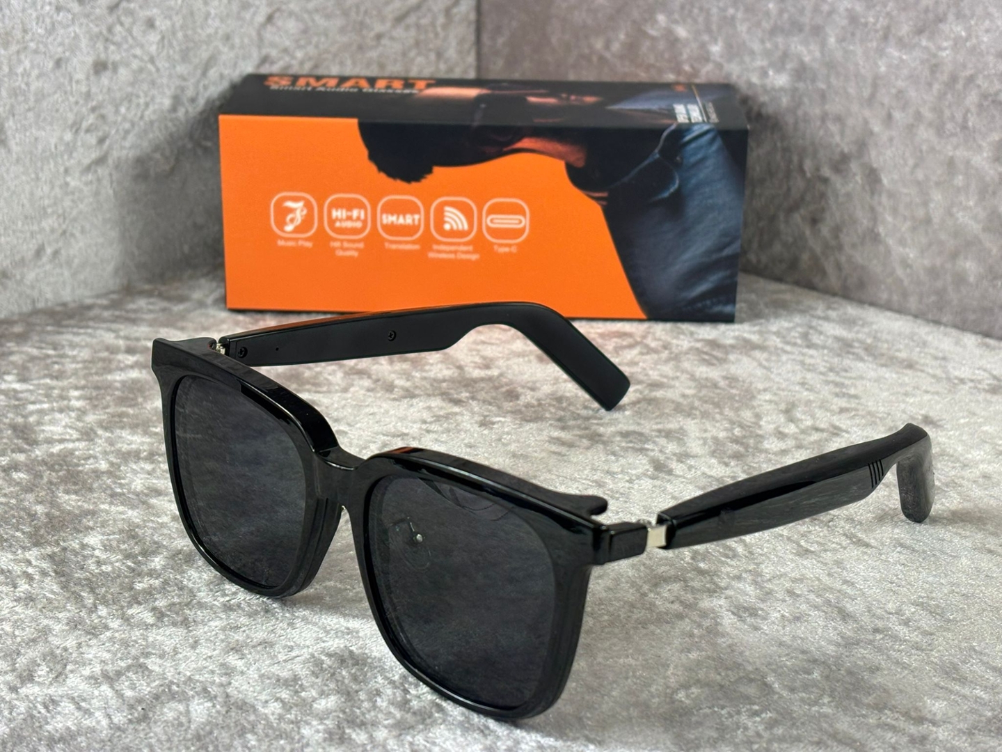 A brand new, unused and boxed pair of smart interchangeable glasses and sunglasses, combining a classic frame design with hands-free audio, built-in call functionality, open-ear sound, and simple lens swapping for seamless everyday and outdoor use.