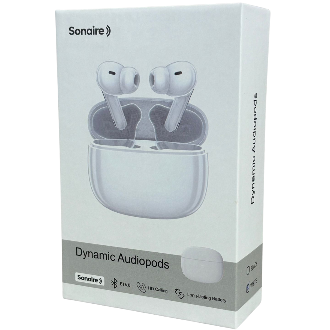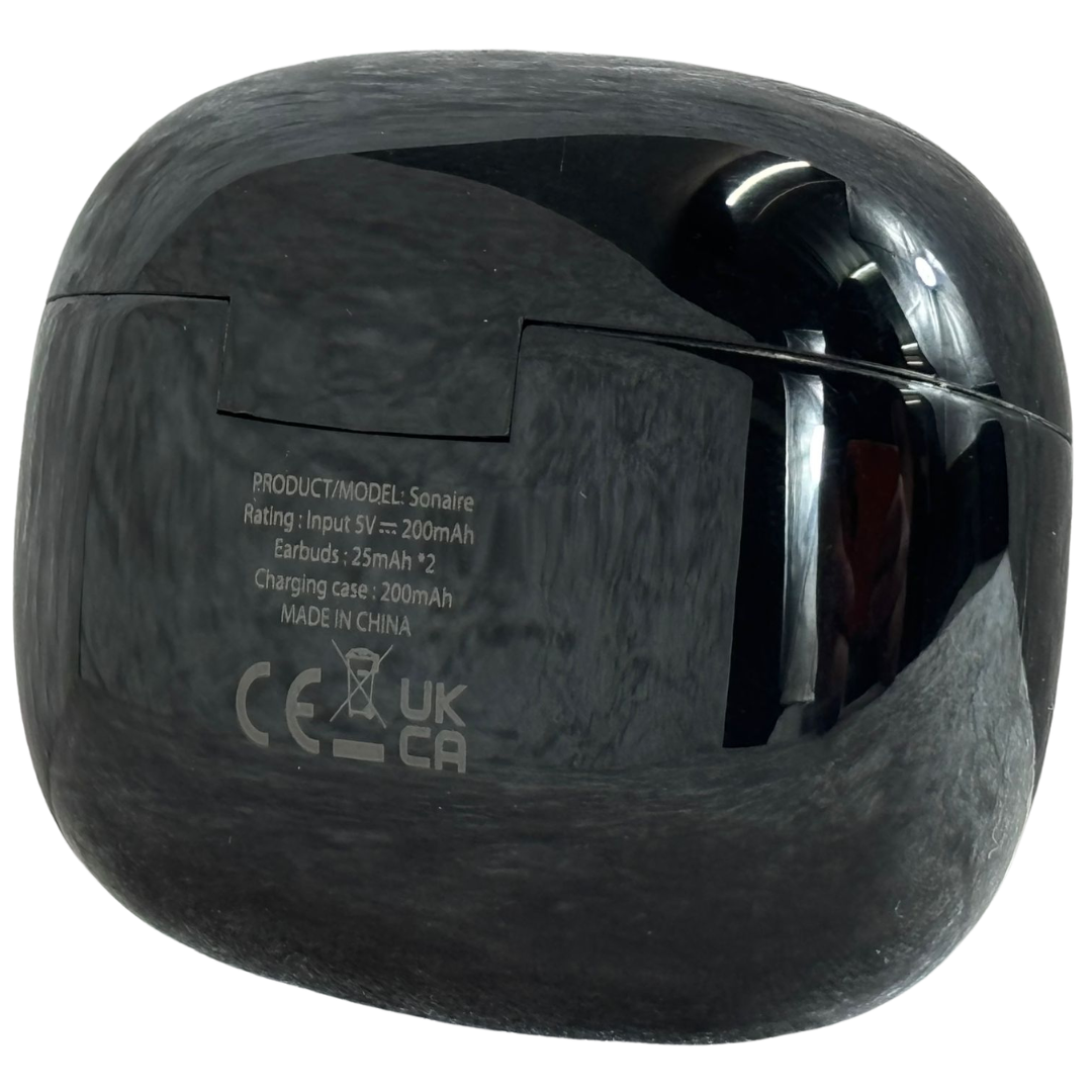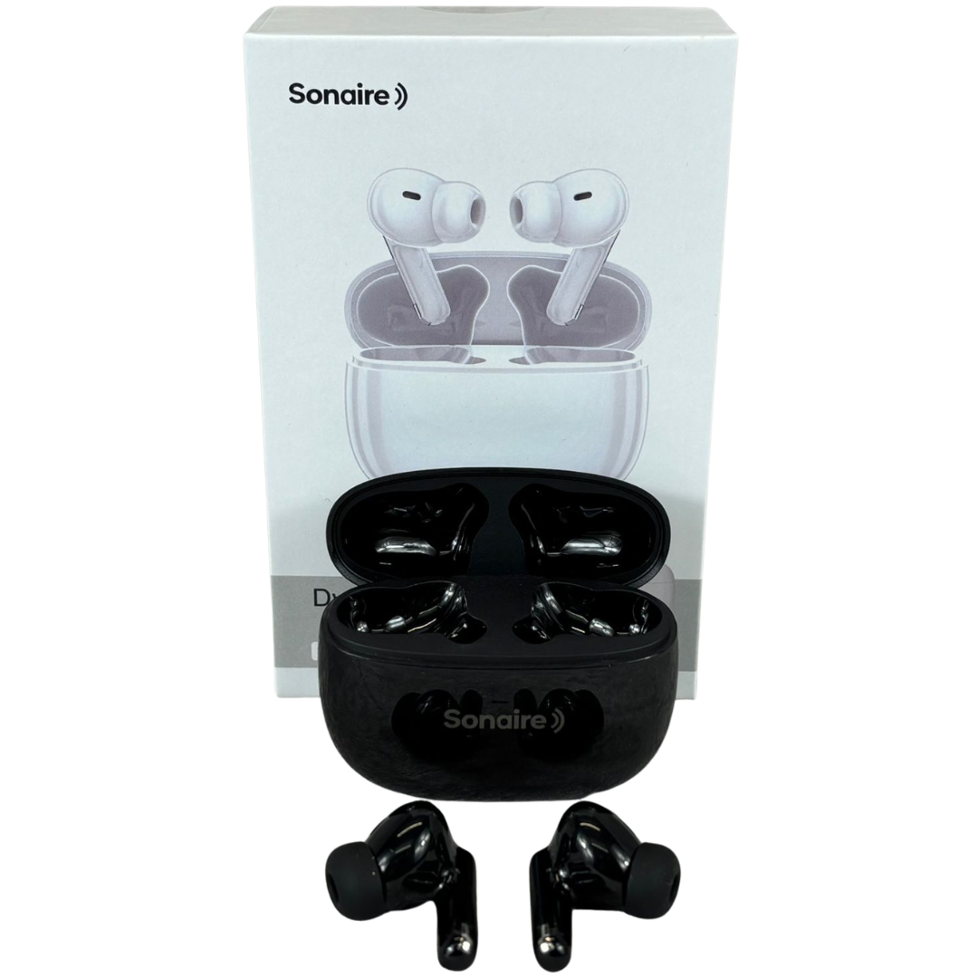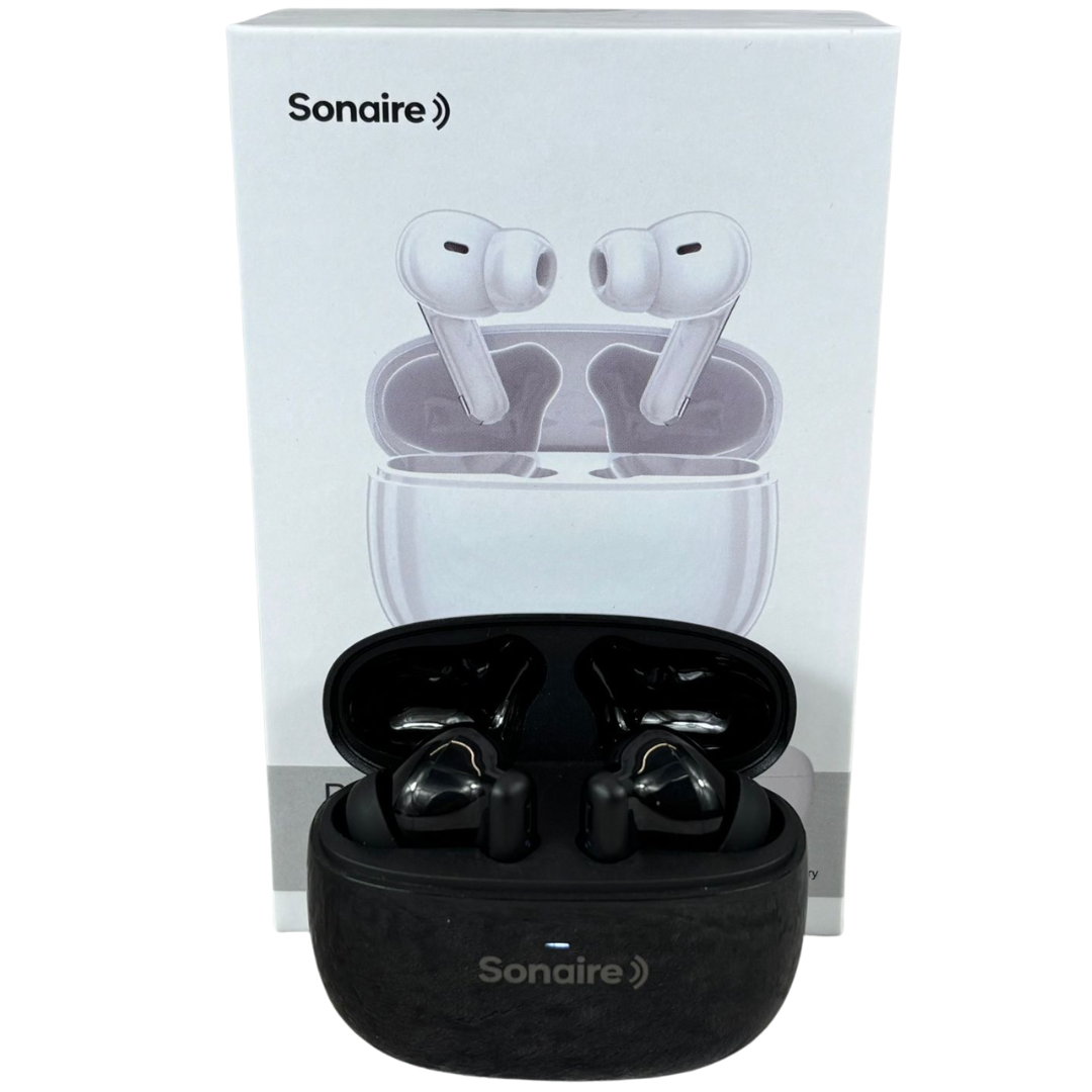 A brand new Sonaire wireless earbuds set presented in a sleek black finish, combining modern design with everyday practicality. Housed in a compact charging case, these earbuds offer a refined, minimalist look while delivering comfortable in-ear wear for extended listening sessions.