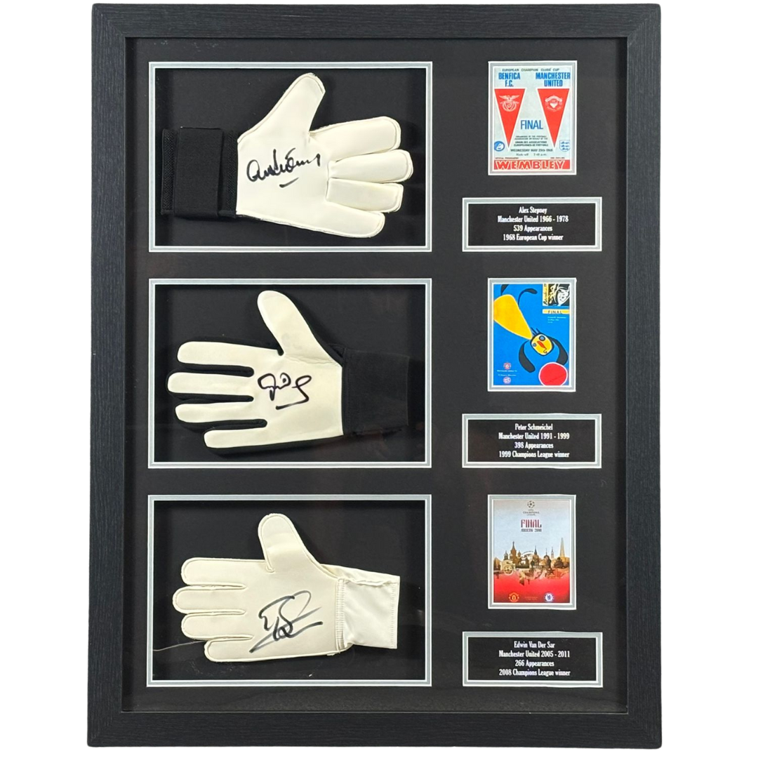A collection of the three Man United Goalkeepers to win the Champions League, signed and authenticated Alex Stepney, Peter Schmeichel & Edwin Van der Sar Goalkeepers' Gloves in a presentation frame. Approx 87cm height, 67cm width.