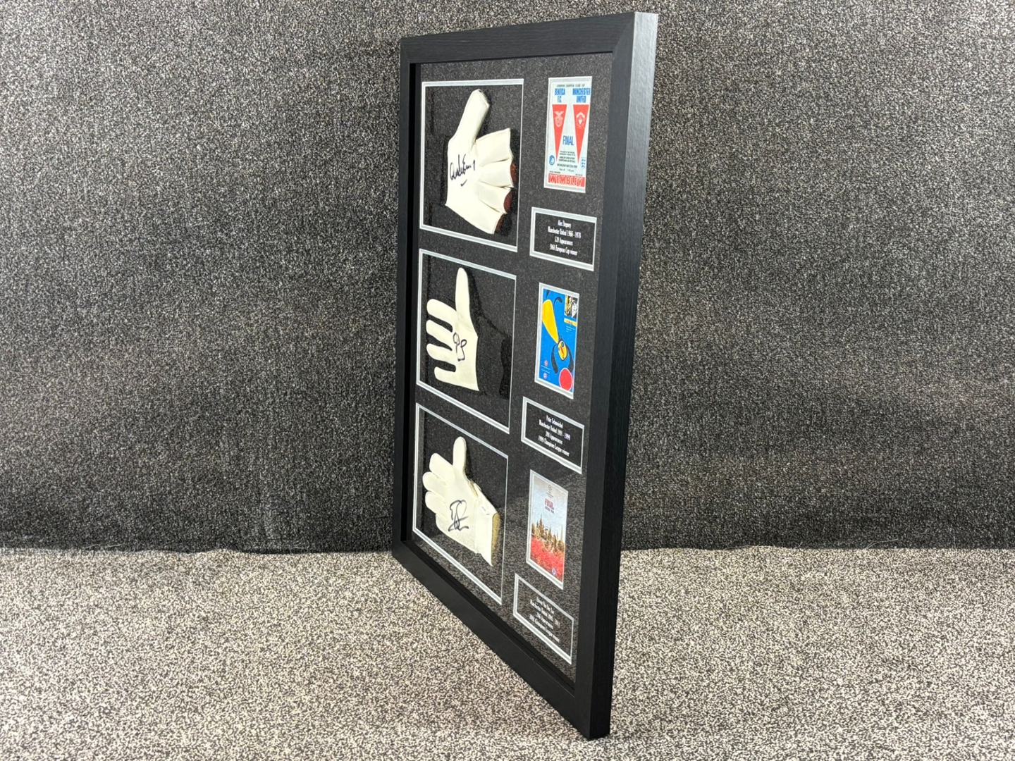 Expertly arranged within a premium black frame, the presentation includes career highlights and commemorative imagery celebrating their historic triumphs in 1968, 1999, and 2008. Each glove represents a defining moment in Manchester United’s illustrious history, capturing the spirit, leadership, and brilliance of these world-class shot-stoppers.