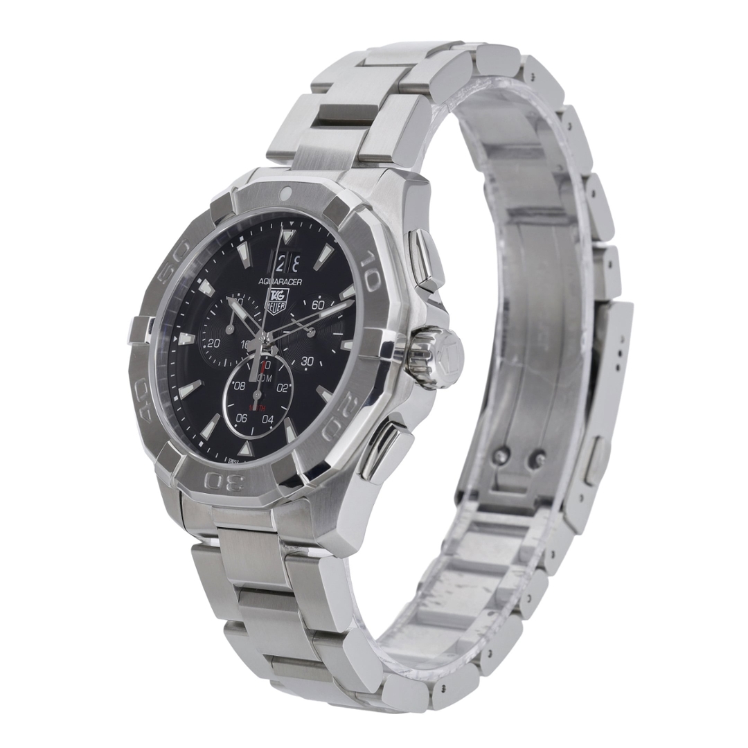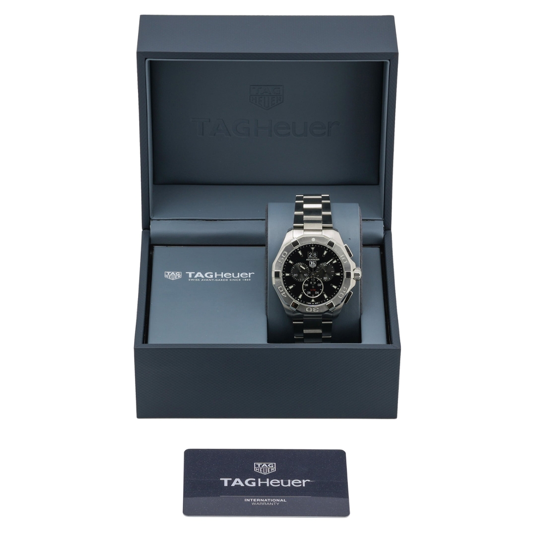 A Tag Heuer Aquaracer Chronograph, reference CAY1110, crafted in stainless steel with a bold black dial and matching engraved bezel. The 43mm case delivers a strong wrist presence, while the unidirectional diving bezel and 300-metre water resistance reinforce its professional sports credentials. The dial features luminous baton hour markers, three chronograph sub-dials, and a prominent double-date display at 12 o’clock, creating a balanced and highly legible layout suited to both daily wear and active use.