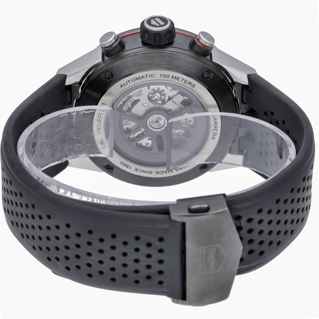 A Tag Heuer Carrera Calibre Heuer 01, reference CAR2A1Z, presented on a black rubber strap with a stainless steel case and clasp. The bold 45mm case delivers strong wrist presence, complemented by a black tachymeter bezel and a striking skeletonised black dial. Red accents across the chronograph seconds hand and hour markers enhance its sporty aesthetic, while the open-worked design reveals the mechanical complexity beneath.