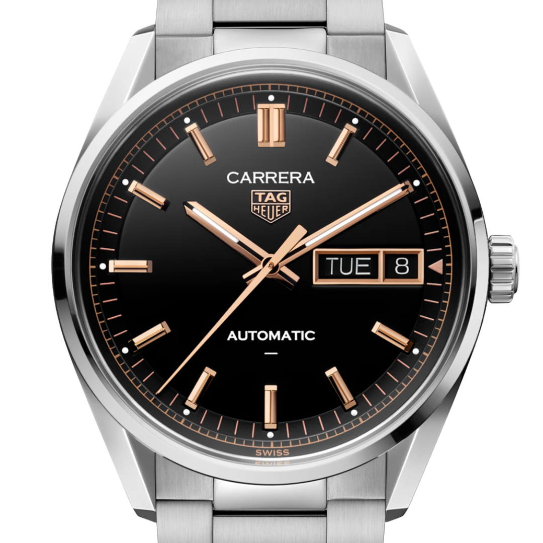 A TAG Heuer Carrera Day-Date reference WDA2111.BA0043 in stainless steel, featuring a black dial with applied rose gold-tone baton hour markers and matching hands. The dial is configured with a day-date aperture at 3 o’clock, alongside a clean minute track and subtle contrasting accents. The 41mm case delivers a refined, balanced profile, maintaining the Carrera’s classic design language while delivering a modern execution.