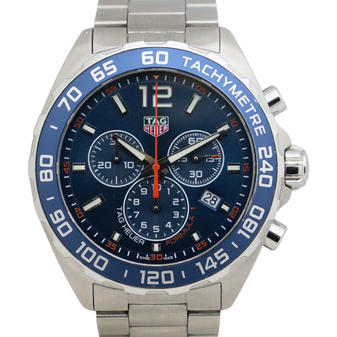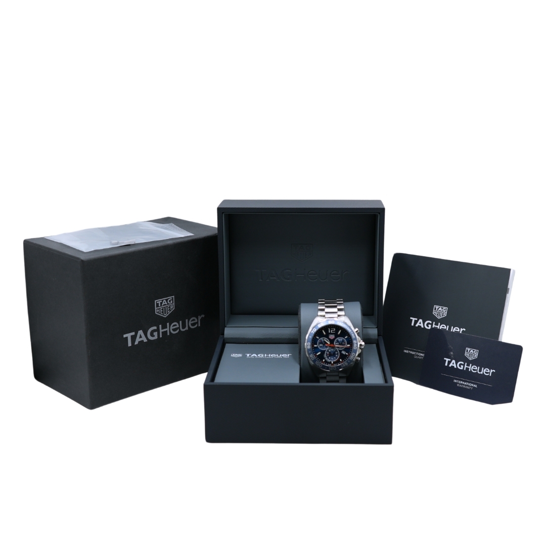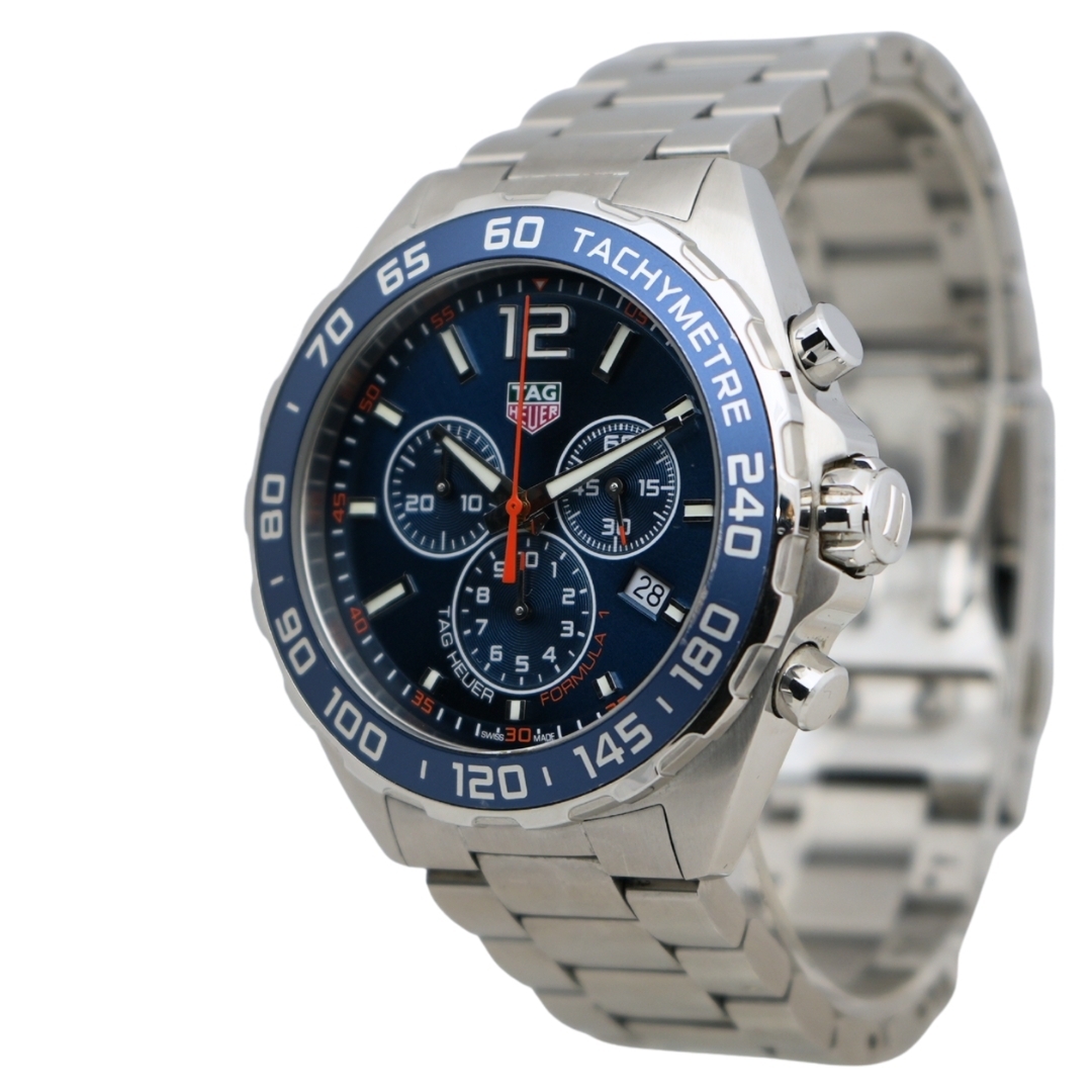 A Tag Heuer Formula 1 Chronograph, reference CAZ1014, crafted in stainless steel with a bold blue dial and matching blue tachymeter bezel. The 43mm case offers a confident wrist presence while maintaining balanced, wearable proportions. Applied hour markers and luminous hands provide strong legibility, complemented by three chronograph sub-dials and a date display at 4 o’clock for everyday practicality. The stainless steel bracelet completes the clean, sport-driven aesthetic that has made the Formula 1 line consistently popular.