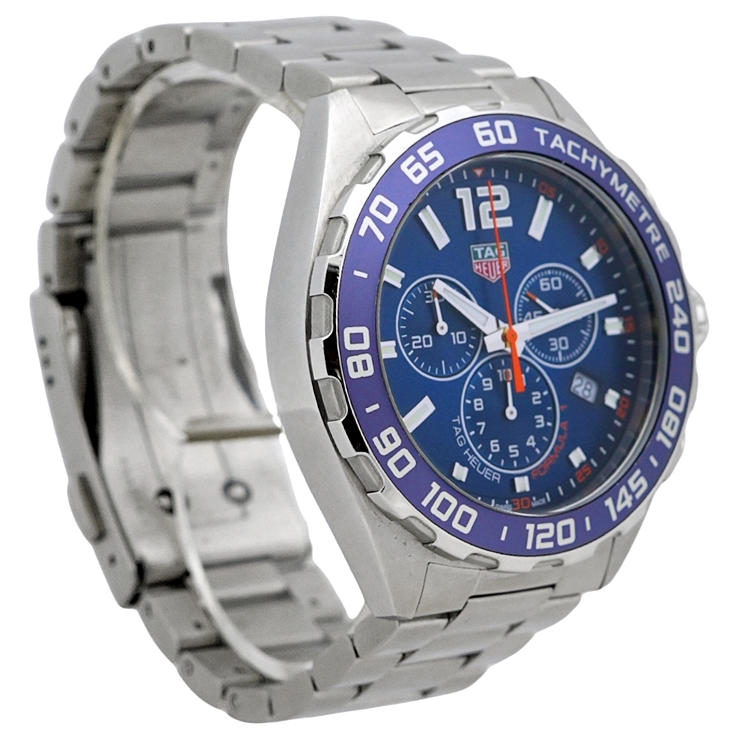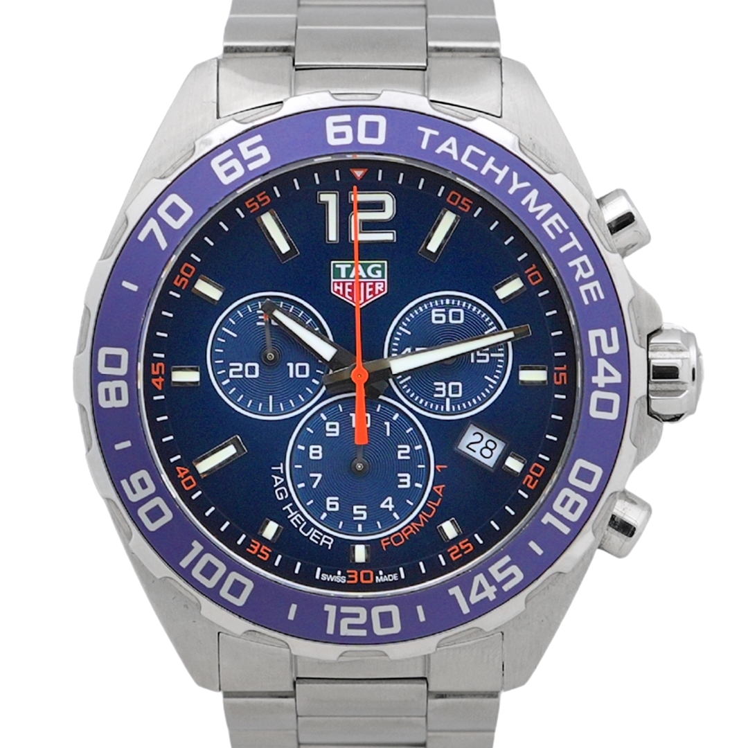 A Tag Heuer Formula 1 Chronograph Watch, Stainless Steel with a Blue Bezel and Dial.