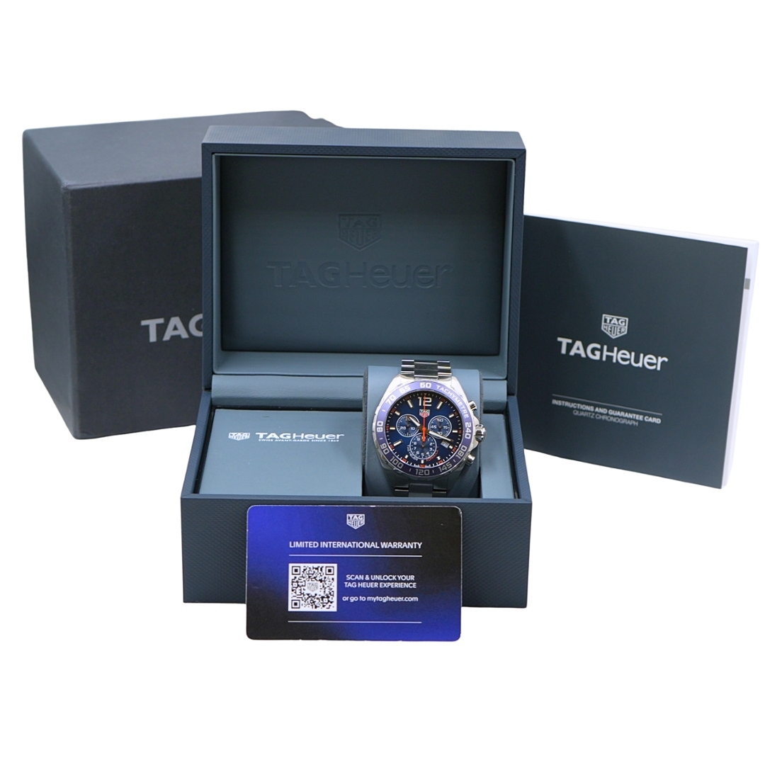 A Tag Heuer Formula 1 CAZ1014 is a striking timepiece combining precision and sporty elegance. This watch features a robust 43mm stainless steel case, making it a versatile option for everyday wear and active use. The blue bezel and dial provide a vibrant, bold contrast, with the bezel’s sleek, angular design enhancing the watch’s modern appeal. The dial is adorned with luminous markers and hands, ensuring visibility in various lighting conditions, while the date window is positioned at the 4 o'clock mark.