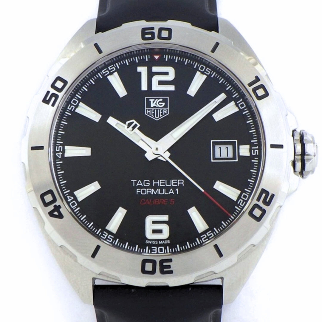 A Tag Heuer Formula 1 reference WAZ2113, presented on a black rubber strap with a matching black dial, delivers a sporty, highly legible design rooted in the brand’s motorsport heritage. The dial features bold, luminous hour markers, oversized Arabic numerals at 12 and 6, and a clean date aperture at 3 o’clock, all framed by a brushed-steel bezel with engraved numerals, giving the watch a strong, purposeful wrist presence.