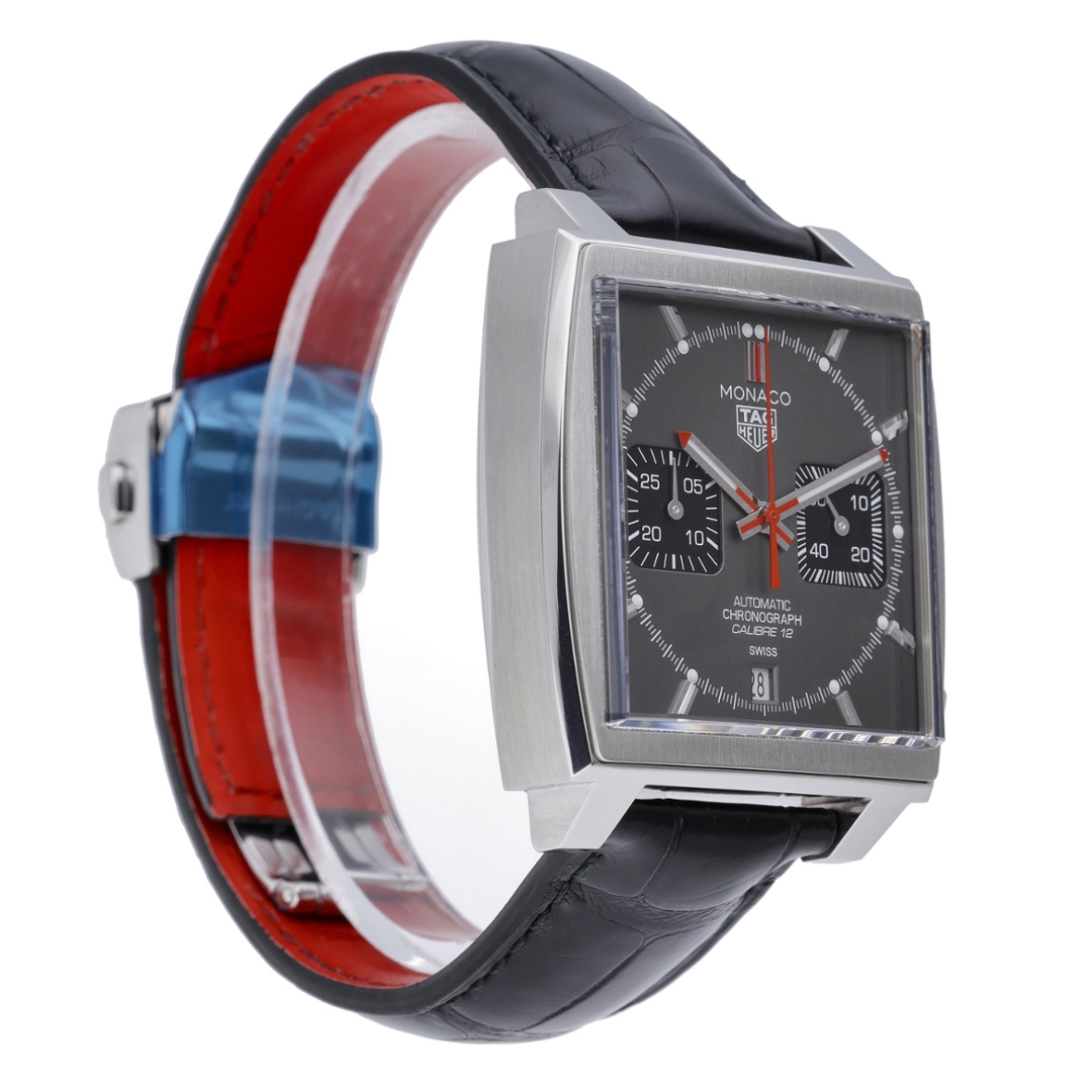 A Tag Heuer Monaco Calibre 12 Final Edition, model CAW211J, is a remarkable tribute to one of the most iconic chronographs in watchmaking history. Encased in its signature 39mm square stainless steel case, this final edition of the Calibre 12 series features a refined grey sunburst dial complemented by two black sub-dials and striking red accents, evoking the motorsport-inspired heritage of the Monaco line. The minimalist layout, combined with bold design cues, creates a perfect balance of elegance and performance.