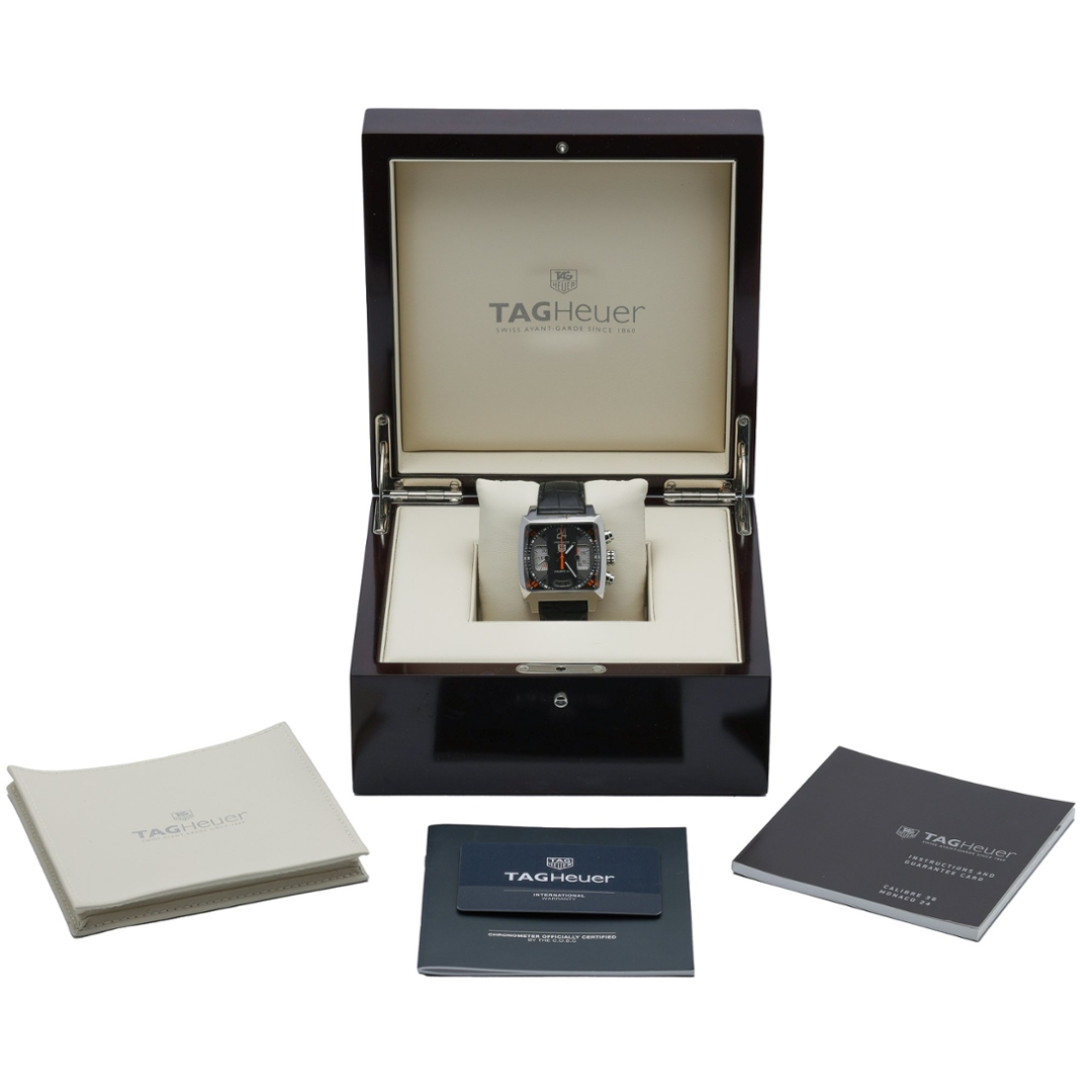 A Tag Heuer Monaco Calibre 36 Watch, Black Leather Strap with a Stainless Steel Case & Clasp on a Grey Dial