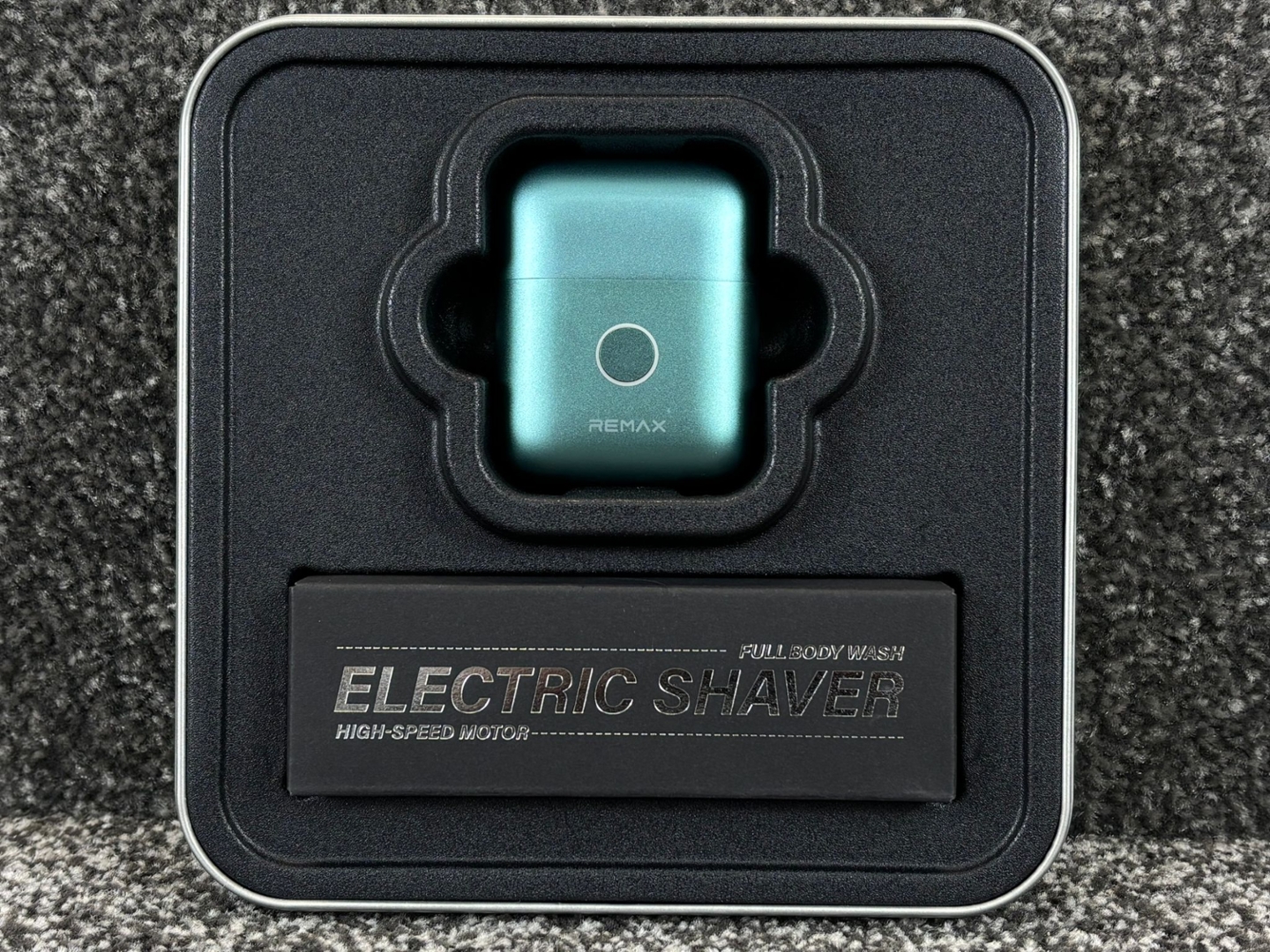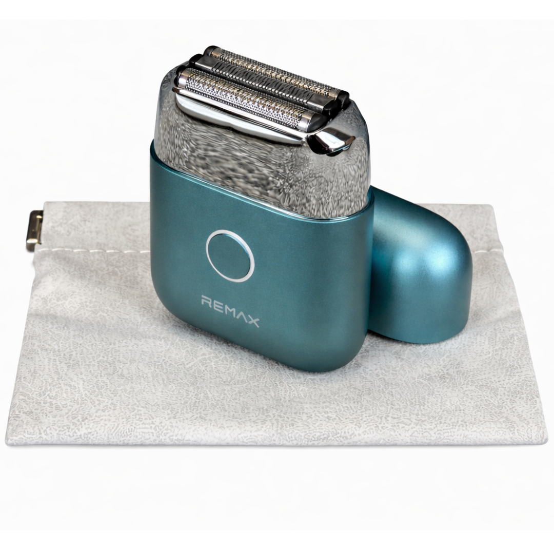 A brand new teal all-metal mini electric shaver designed for convenience, performance, and modern portability. Finished in a sleek metallic teal tone, this compact device offers a premium feel while remaining lightweight and easy to carry, making it ideal for travel, daily grooming, or on-the-go touch-ups. Its durable all-metal construction enhances both longevity and style.
