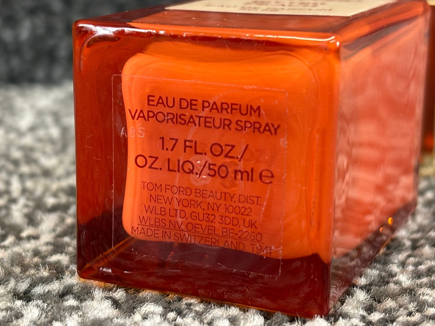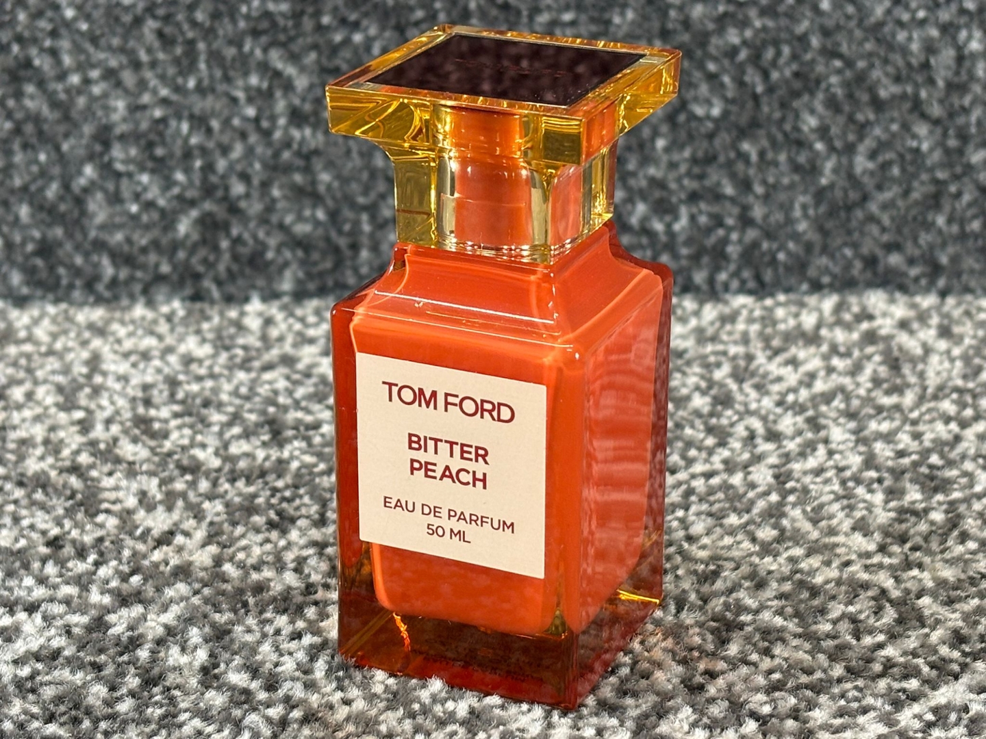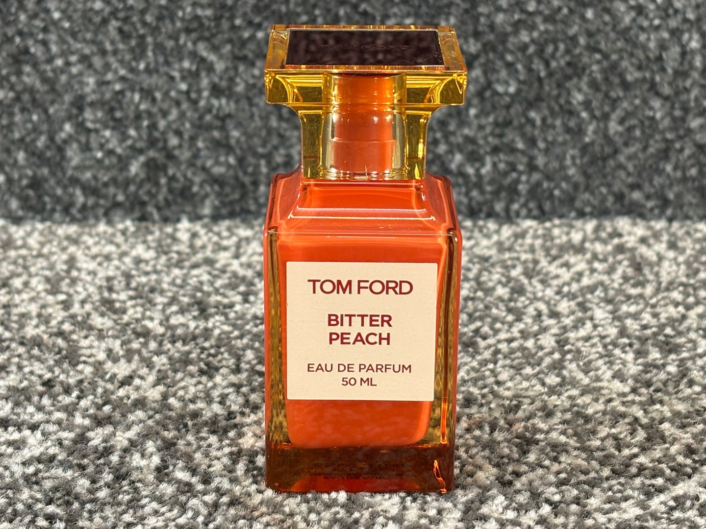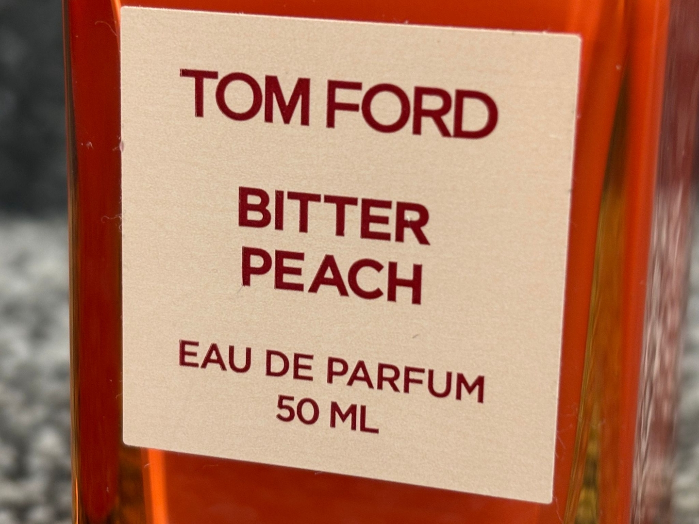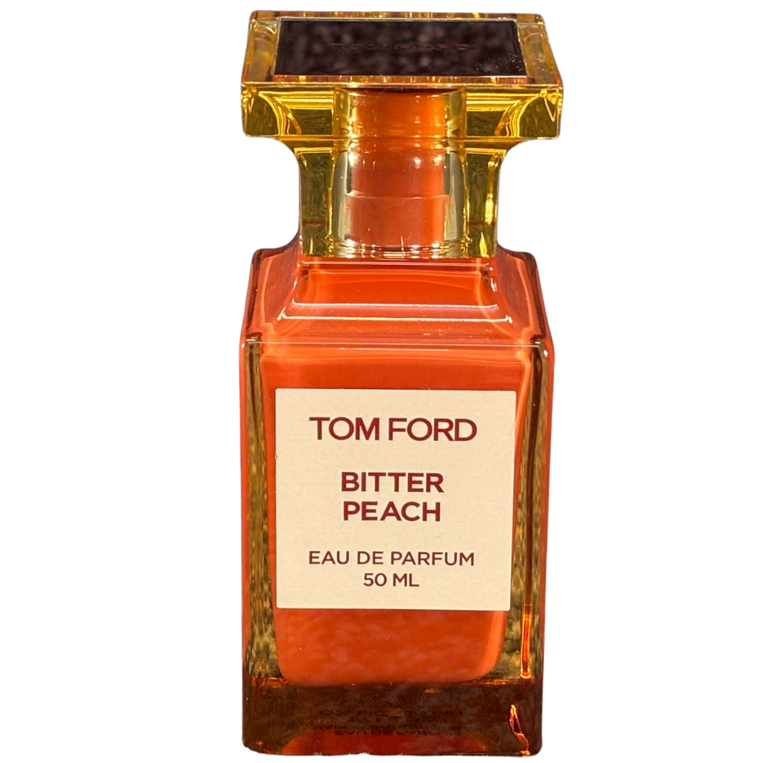 A 50ml bottle of Tom Ford Bitter Peach Eau De Parfum, a daring