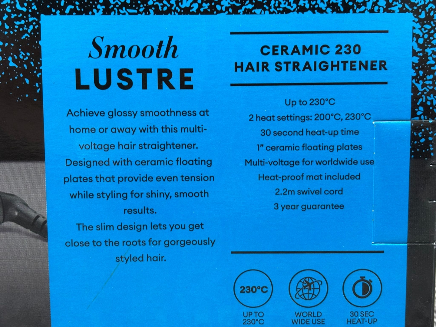 Featuring ceramic-coated plates, it delivers even heat distribution to help reduce hot spots and protect your hair during styling. With a maximum temperature of up to 230°C, it provides the power needed for fast, effective straightening across a range of hair types. The rapid 30-second heat-up time means you can begin styling almost instantly, while worldwide voltage makes it ideal for travel.