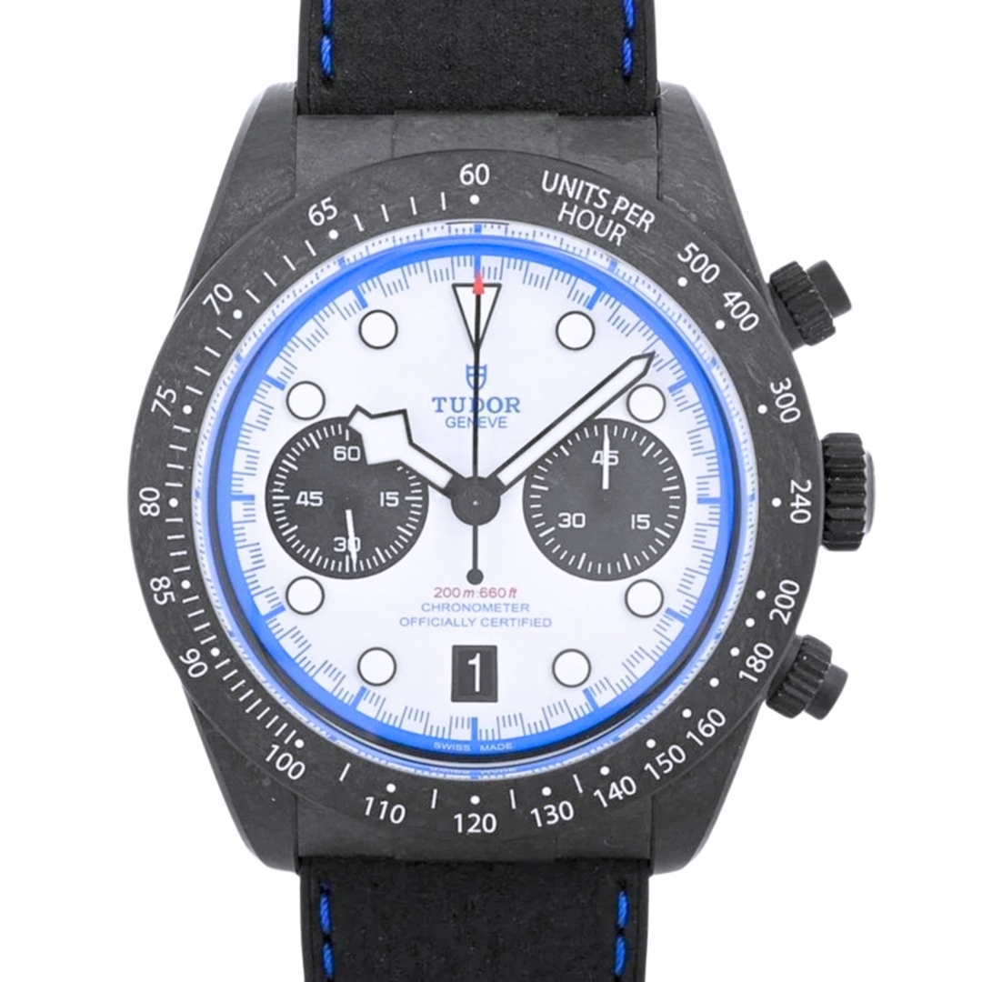 A Tudor Black Bay Chrono Watch, Black Rubber Strap with a Carbon Fibre Case & Clasp on a White Dial