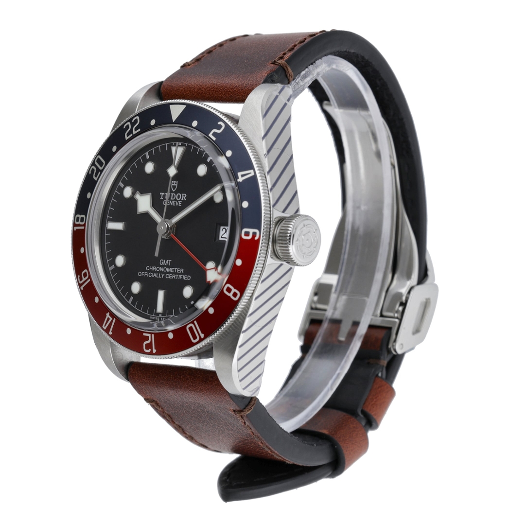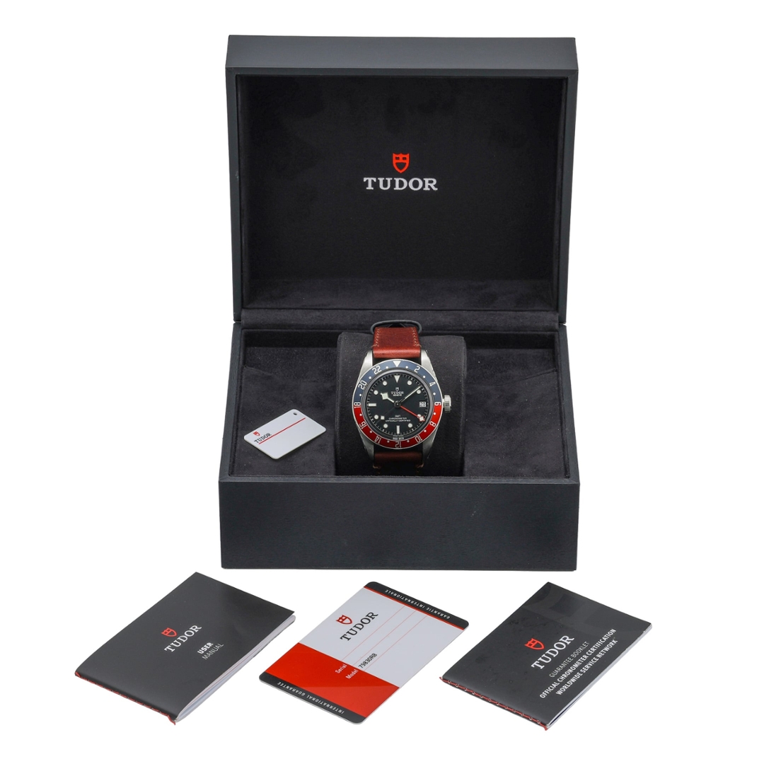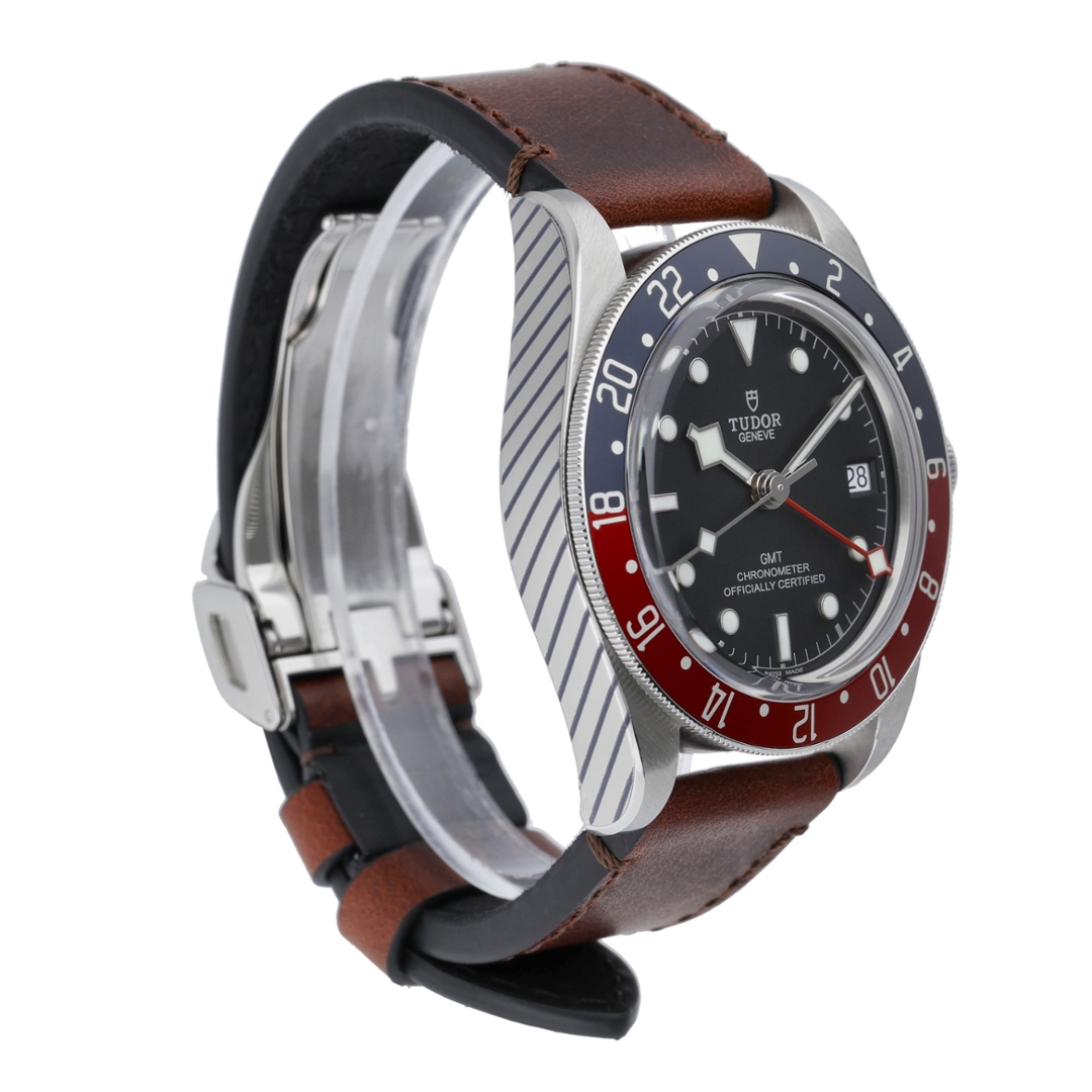 A Tudor Black Bay GMT Watch, Brown Leather Strap with a Stainless Steel Case & Clasp and a Blue/Red Bezel on a Black Dial