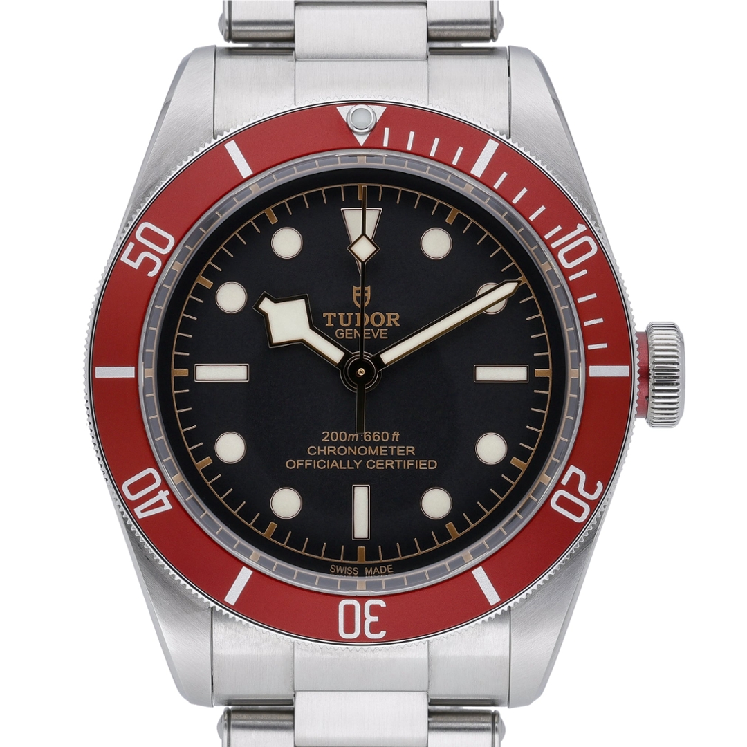 A Tudor Black Bay Watch, Stainless Steel with a Red Bezel and a Black Dial.