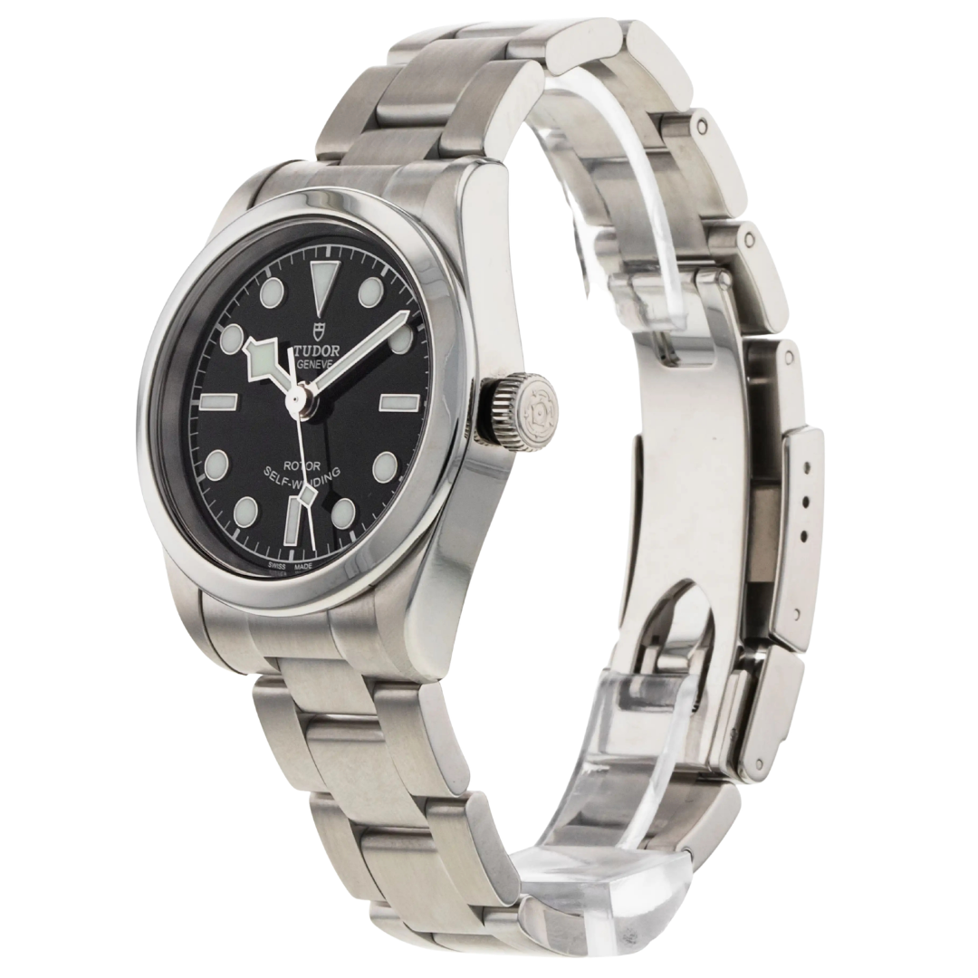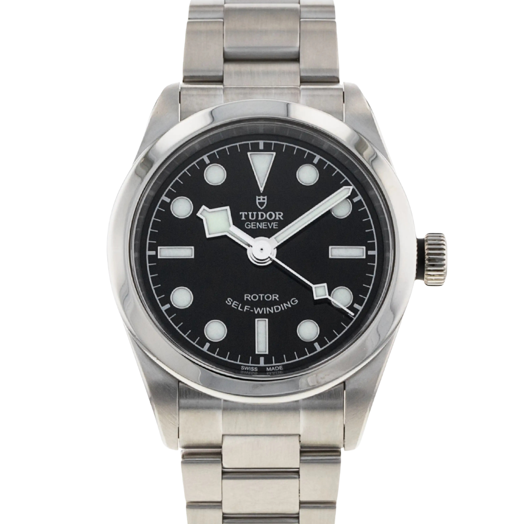 A Tudor Black Bay reference 79580 in stainless steel, featuring a 32mm case with a smooth, polished bezel and compact, balanced proportions. The black dial features luminous hour markers and Tudor’s signature snowflake hands, offering clear legibility while maintaining a clean, understated aesthetic suited to everyday wear.