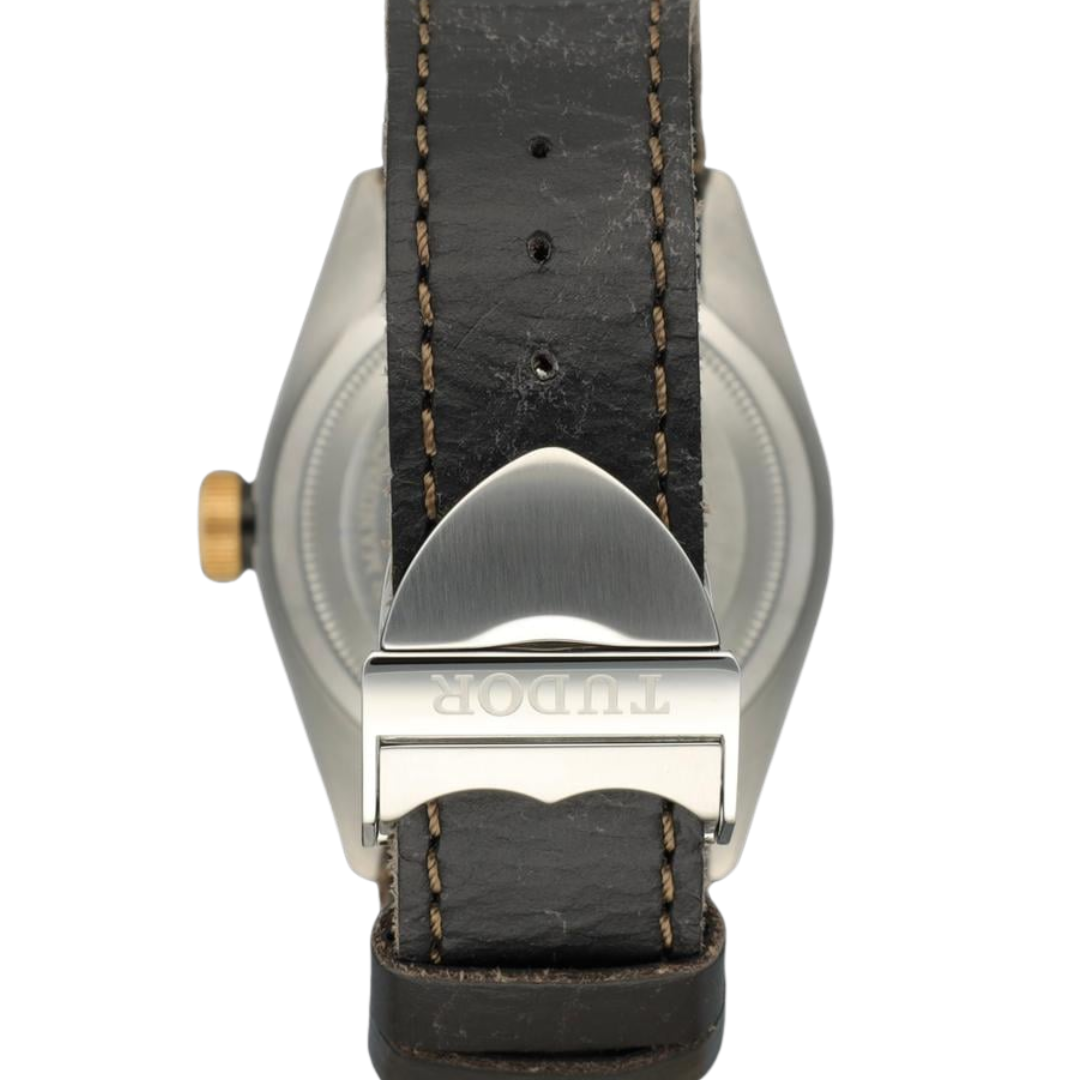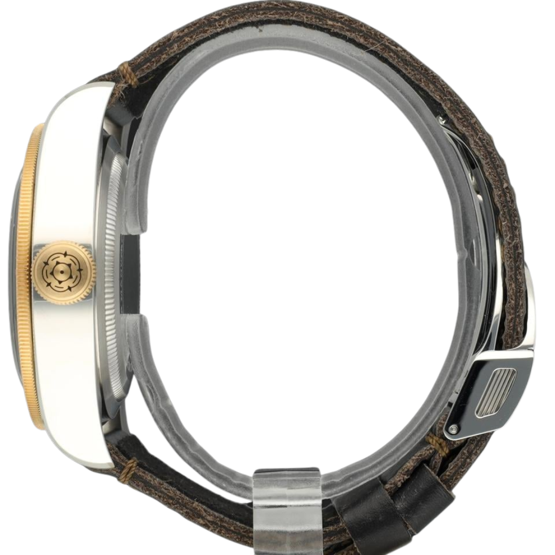A Tudor Black Bay Watch, Bi-Metal, Stainless Steel Case and Clasp & with an 18ct Yellow Gold Bezel on a Black Dial with a Black Leather Strap.